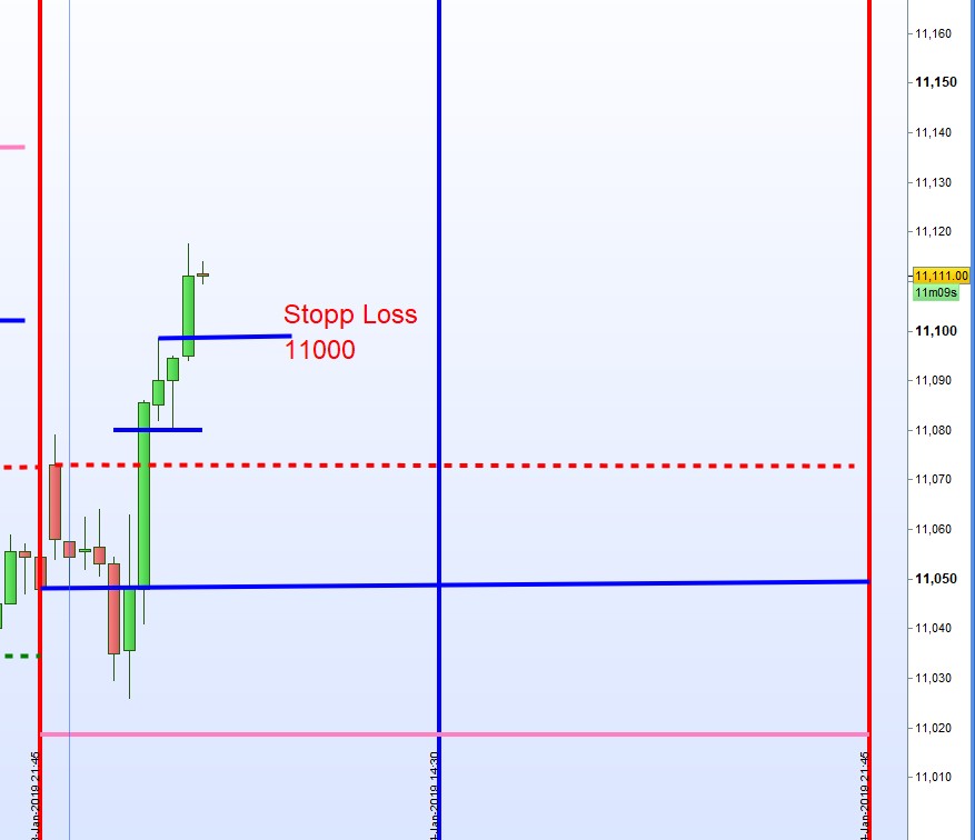 Nos queda un tercio de los contrados con 100 puntos de beneficio. Si el precio continua a subir despues de las 13:45h el stopp loss sera como dibujado. Si bajase antes podemos considerar el stopp loss anterior. Este es una apreciacion sobre la marcha. Hemos tenido ya un buen dia y hay que proteger los beneficios. A lo mejor habra una extension de rango.