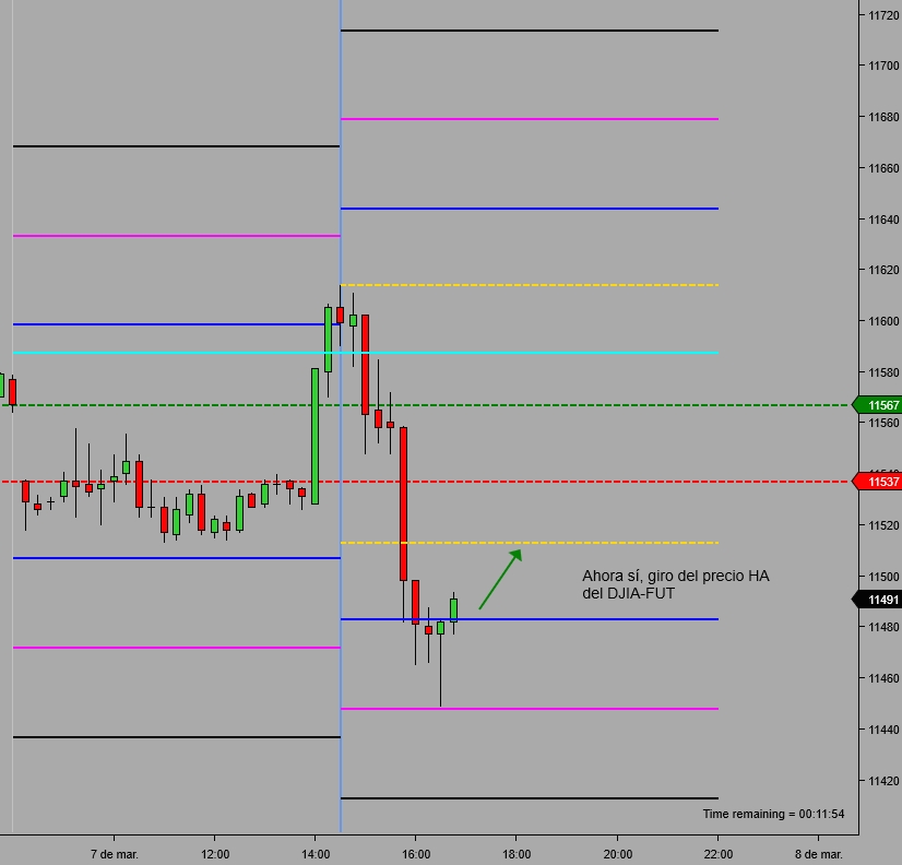 Además tampoco veo ni una sola de retroceso alcista tanto en el FDAX como en DJIA-FUT ni en velas temporales ni HA. Para mi no tiene sentido en el día de hoy meterse en la 1º zona, pero la experiencia la tiene George. Puedo equivocarme.