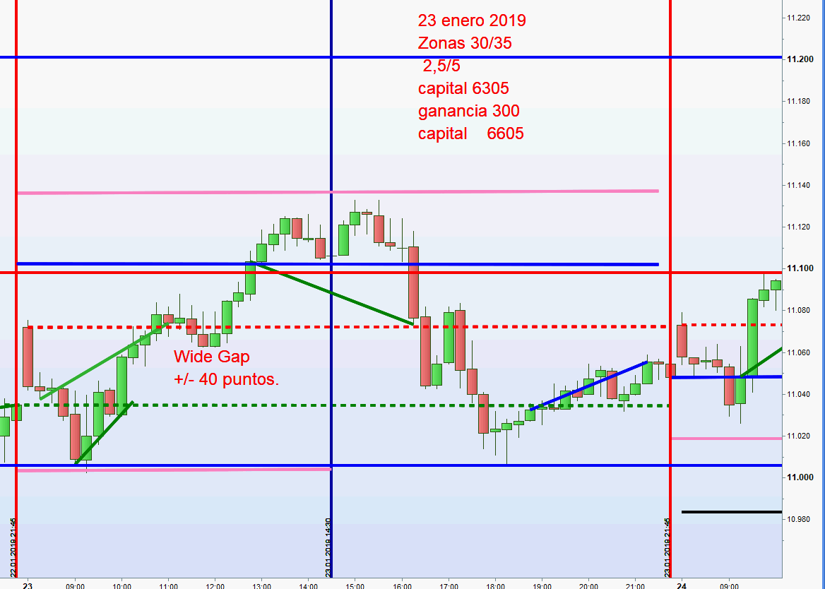 4.- Veo que se ha dejado la operación de la primera zona abierta antes de las 14,30 para llegar al close del cierre de ayer . Con lo que en este punto no ha sobrepasado ni la linea close de ayer, sólo la ha tocado. Y este hecho lo consideramos como correcto para ejecucción del setup de cruce ya que posteriormente el precio baja y consideramos apertura de posición en segunda zona. Es decir, estamos mezclando dos cosas, una operación abierta antes de las 14,30 con objetivo el close y otra es el setup de cruce claro de la linea de close de ayer.