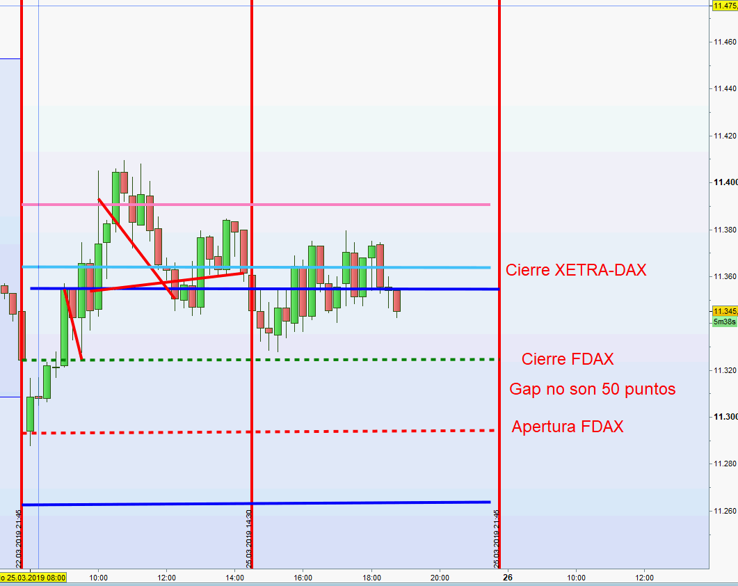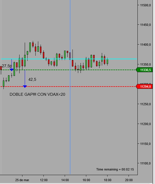 Correcto Fran. Hoy es un día borderline, ya que la suma supone 70p, y es cierto que el gap debería tener +-50p, al ser de 43p + gap xetra se podría considerar doble gap. Pero siendo puramente estricto sería un widegap!!Fran_J escribió: 25 Mar 2019 18:40 El tema del doble hueco ya lo hemos hablado en otras ocasiones, dijimos que el Gap XETRA tiene que tener por lo menos +- 20 puntos y en la misma dirección el Gap FDAX también por lo menos +- 50 puntos, y la suma de los dos por lo menos de +- 70 puntos. El Gap FDAX de hoy tiene menos de 50 puntos de ahí mi inclinación mas hacia el Wide Gap.