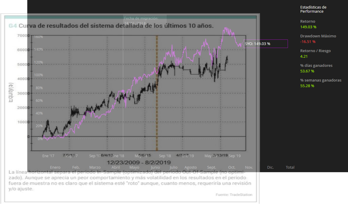 Bien; un artículo que describe un sistema anti-tendencial con una serie de características, estudios, y unos resultados, dentro y fuera de muestra. La gráfica de balance es: