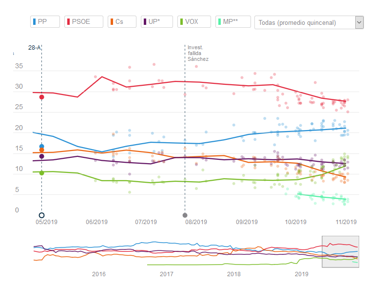 Hagamos un poco de recapitulación de la situación previa a las elecciones: en el siguiente gráfico tenéis un promedio de todas las encuestas realizadas hasta el 2 de noviembre (por tanto recoge el impacto de noticias tan relevantes como la exhumación de Franco o los disturbios en Cataluña).
