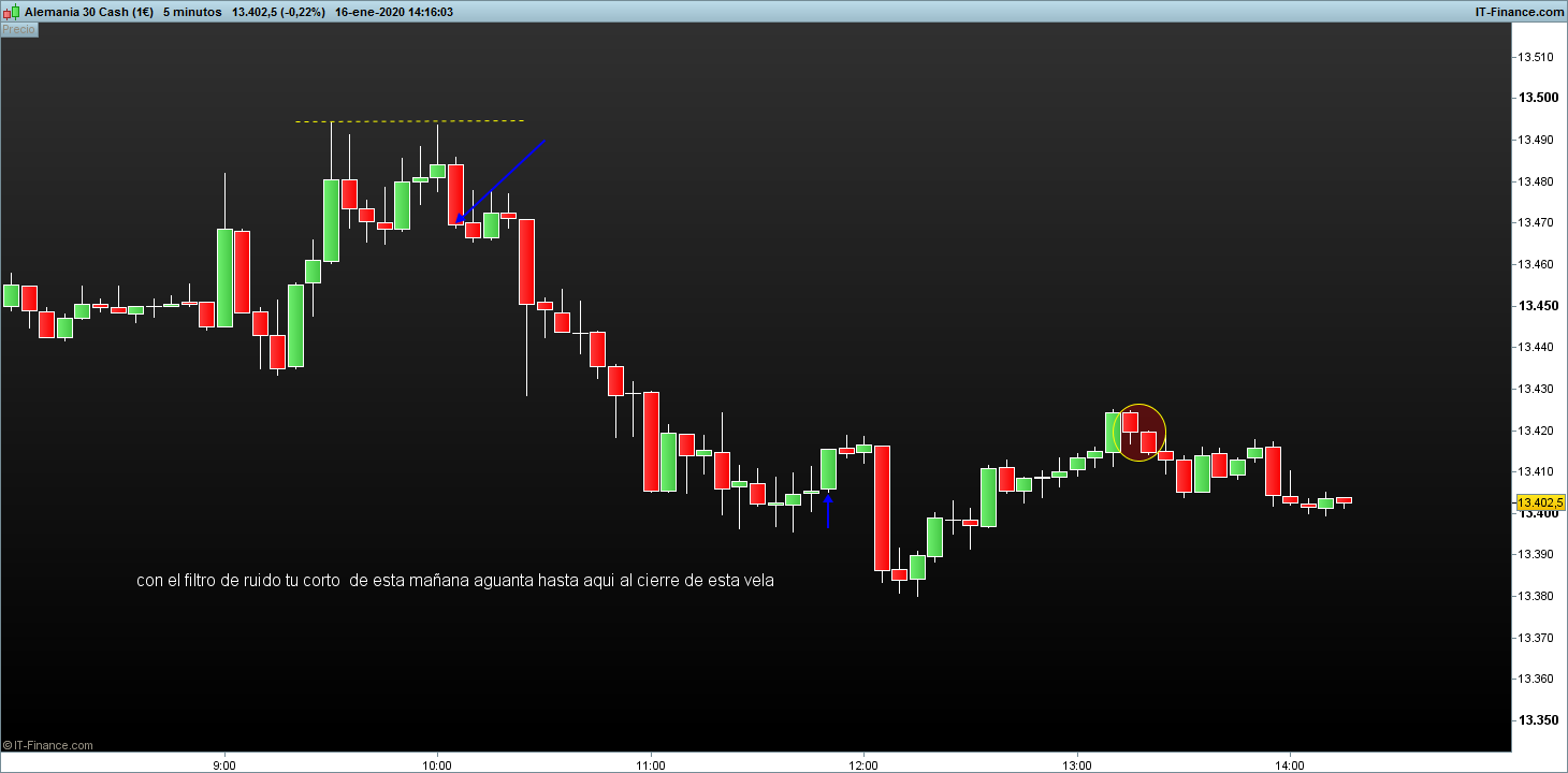 Tomar esas zonas como sesgo de entrada a poco que le añadas al sistema si dejas correr las opes … :D :D :D …………..jejeje, pero eso no es el filtro de ruido que comento. Si miras la gráfica de 5 minutos de tu primera operación que colgué, ahí está el filtro de ruido actuando hasta que una vela el cierre lo marca por encima del MAXIMO del rango de la vela anterior, esa vela reversal rompe la dinámica de todo el movimiento a cortos que baja respetando el máximo de vela previa al CIERRE