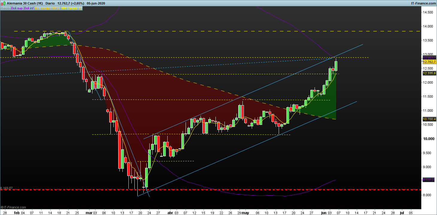 El dax esta subiendo con un volumen ridiculo, no hay ventas que frenen y tienen mucha prisa por subir, desde el 14 de mayo van a velocidad de crucero y acelerando