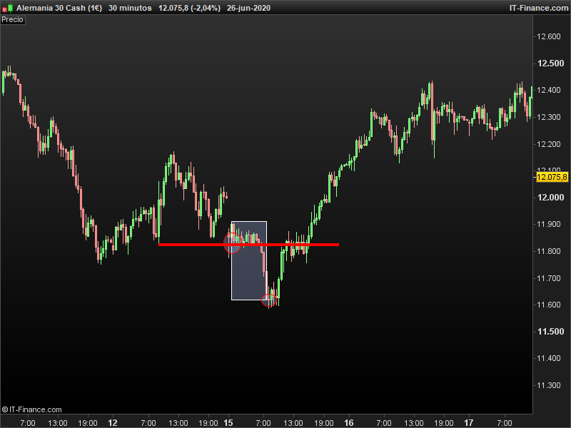 Es decir, usar la 1ª vela de 30 minutos para "predecir" el probable sesgo de la sesión, pero no usar su tamaño para fijar el stop loss.