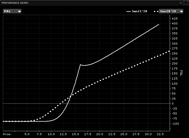 En mi poca experiencia operando opciones sobre el VIX y viendo sus gráficos en TOS, el gráfico es poco fiable, especialmente en la curva T+0. En IB la curva a vencimiento se parece algo a la de TOS, pero la T+0 es muy diferente (cuando la grafica). De todas formas, no suelo operar el VIX más que esporádicamente y con estrategias simples.OptionExpert escribió: 27 Nov 2019 12:13 cuando la cierre posteo El resultados y vemos si acierta. Para mi la operacion tiene mas vuelo por arriba que lo que da ese gráfico, por abajo si pierde