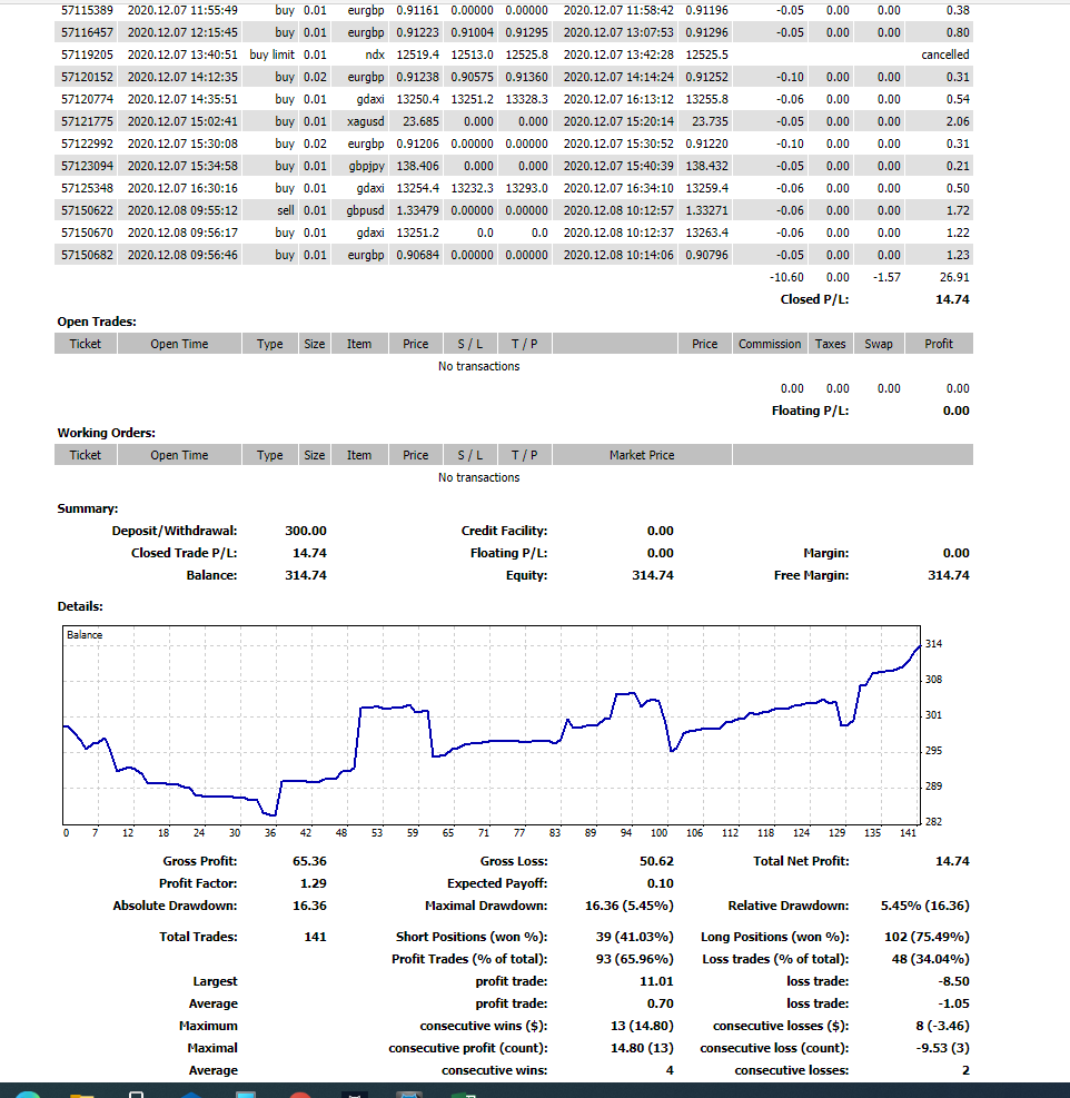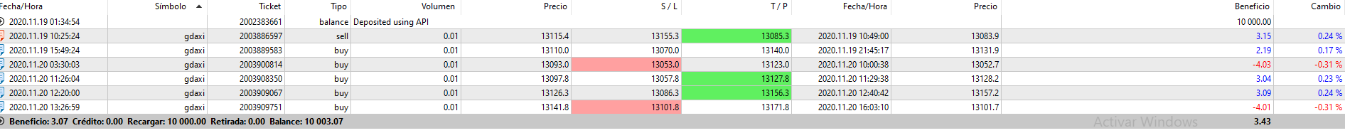 Subo imagen de los resultados de mi EA. Los míos mejor no verlos por que tienen pérdidas. Incluso estoy pensando poner a la EA en real y a mi en demo, ja, ja, ja....