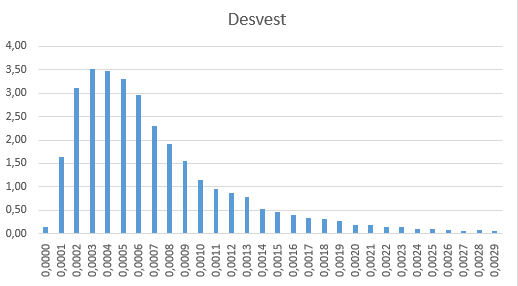 Voy a ponerme un poco serio para intentar mejorar la operativa. Para ello testeamos el EURUSD. Lo primero que necesitamos saber es la volatilidad por horarios. Nos encontramos que la mayoría de las barras de 5M no sobrepasan los 4 pips.