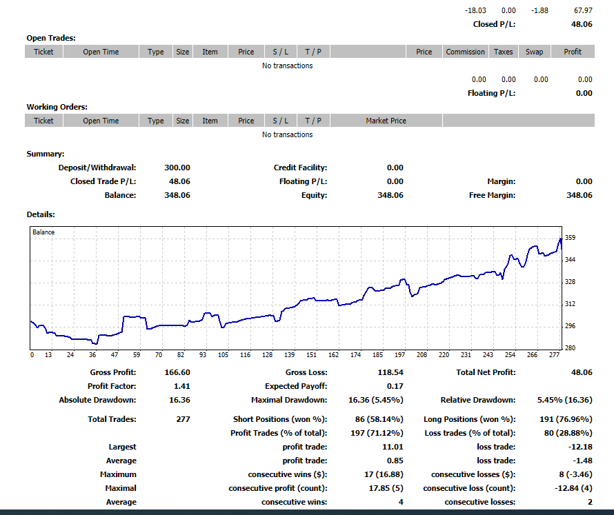 - Tienes una ganancia media de 5 pips y una pérdida media de -15 pips. Si no fuera por ese casi 74% de acierto que tienes, la cuenta estaría condenada a tener abundantes pérdidas, cuidado con eso.