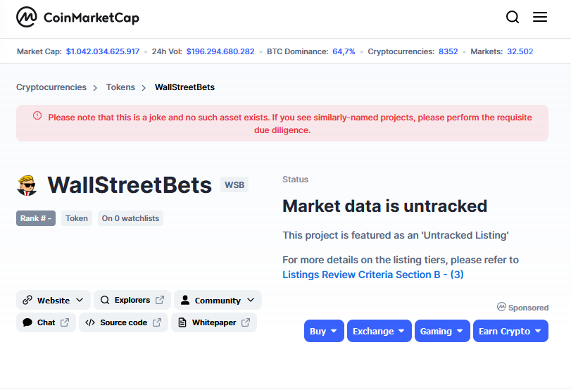 Última hora: ahora parece ser han colado un token ficticio de WallStreetBets, el WSB, en el listado de CoinMarketCap: