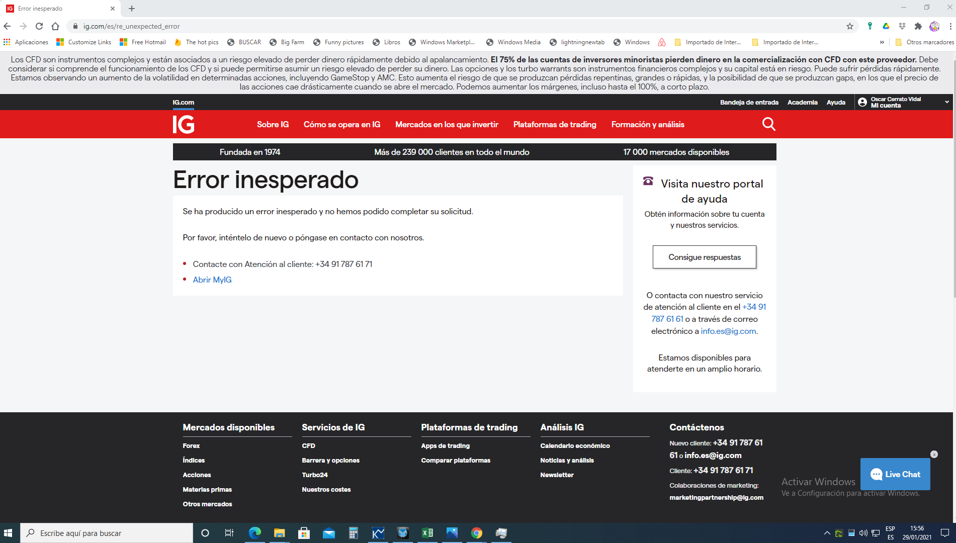 yo llevo operando años con ig y usando sus opciones.Ayer tuve problemas para entrar en su web desde la apertura de usa hasta 21 minutos despues exactamente.El telefono petado.Y hoy me ha vuelto a pasar igual pero menos minutos.Por supuesto no puedes operar.Al habla con ellos me comentan que el trafico de clientes y web se ha multiplicado muchisimo en los ultimos tiempos y si todos operamos a la vez pasa esto.Ya hace años tuve un problema con ellos y desde entonces siempre les mando email inmediatamente reclamando lo que estime oportuno.Pero el email lo mando inmediatamente .Asi que te invito a que les mandes tu queja cuando ocurra estas cosas.
