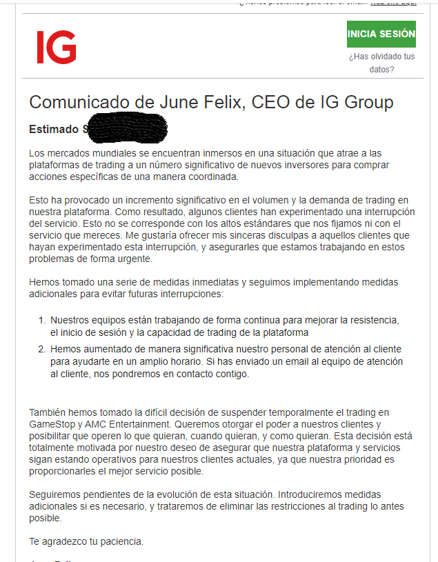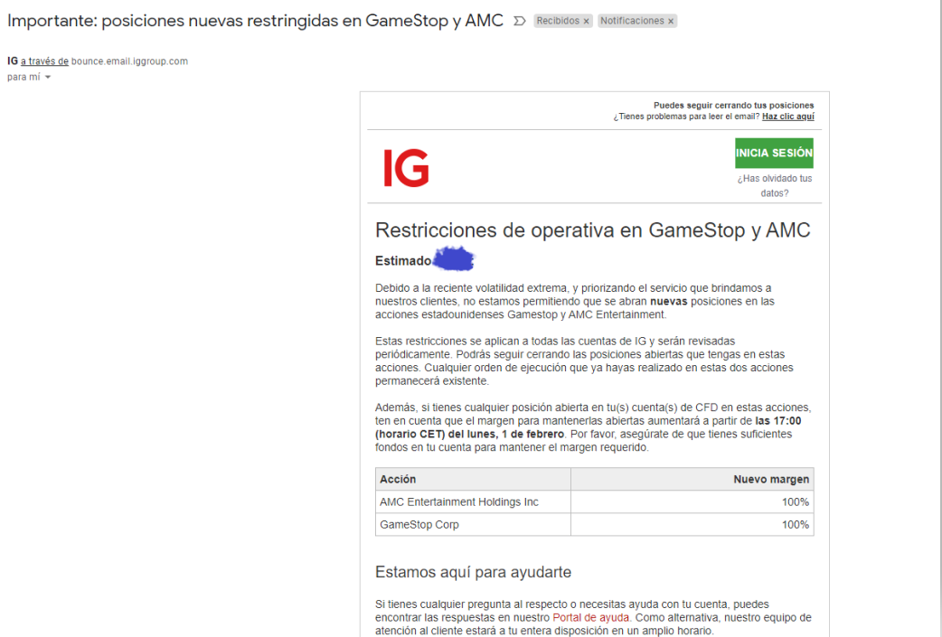 Son tan groseros que ni siquiera dan razones legales o técnicas para la suspensión. Textualmente dicen: "no estamos permitiendo que se abran nuevas posiciones en las acciones estadounidenses IG y AMC" Es decir, que no las venden por que a ellos no les sale de los eggs. Es propio de las timbas más cutres el impedirle la entrada a los jugadores ganadores y eso es exactamente lo que está haciendo IG Markets con los microinversores de GMS y AMC.