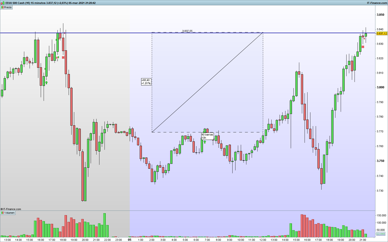 un trading de estos se coge desde abajo y en realidad se sale o porque va a volver a caer, o ,.. cuando toca el cierre mas alto de la serie temporal. Eso da recorridos interesantes, y si de ahi cae, aguantas 100 puntos mas o menos para cargar contratos, y la estadistica te dice que llevarias 6 años sin perder un trade de estos... pero vamos ... el lunes cuando dio entrada pase de pillarla... y me olvide de esto toda la semana..