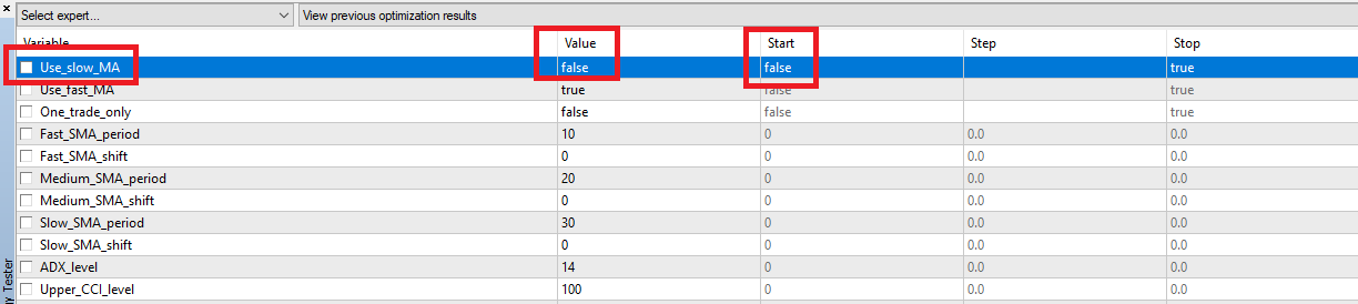No estoy acostumbrado a hacer optimización en MT5, de manera que seguro que es una pregunta tonta, pero la hago de todos modos. Estoy intentado optimizar un EA que usa parámetros de entrada logicos (true/false). A la hora de optimizar, puedo escoger el valor inicial, pero no los de inicio y fin de la optimización.