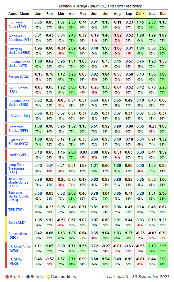 Por cortesía de mi buen amigo Frank Data aquí tenéis una tabla extraída de Lazy Portfolio ETF que resume de forma excelente la estacionalidad por meses de múltiples tipos de activos (acciones, bonos, commodities) que os puede servir para filtrar vuestras operaciones y mejorar el timing de carteras de medio y largo plazo. Espero que os resulte de utilidad: