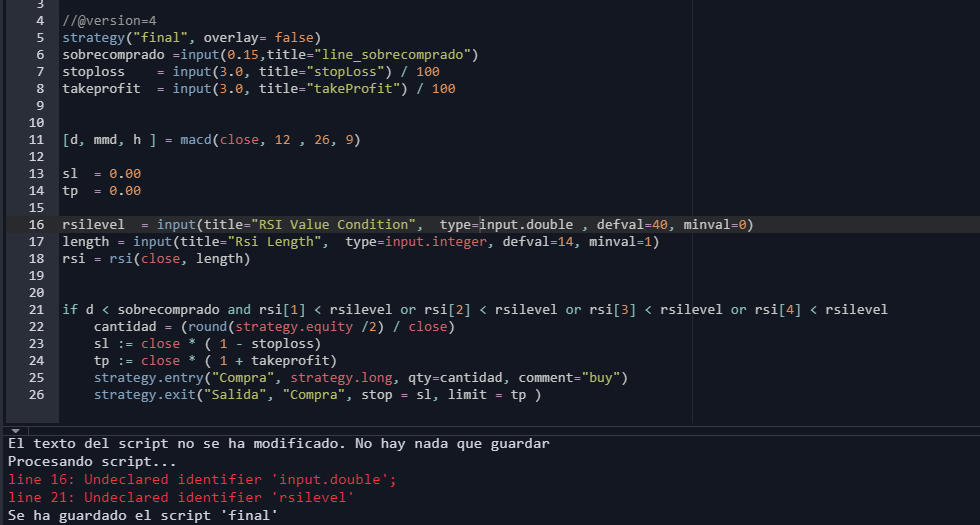 sebaas escribió: 01 Ene 2022 16:08 Hello , I wanted to ask how do I put a condition (if ....) that RSI has been less than 40 in any of the last 4 candles? (It is a strategy with version 4 of pine script)
