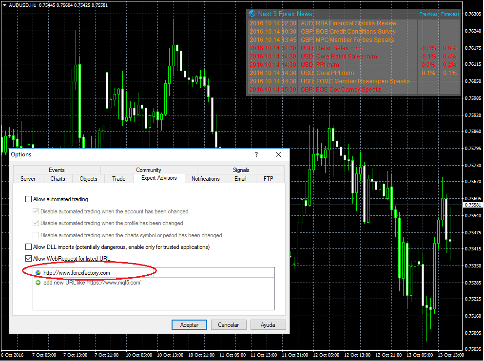 Tened en cuenta que para que funcione, en la pestaña Expert Advisors de las opciones de vuestra Metatrader debéis autorizar una Webrequest al dominio http://www.forexfactory.com tal y como se muestra en este pantallazo: