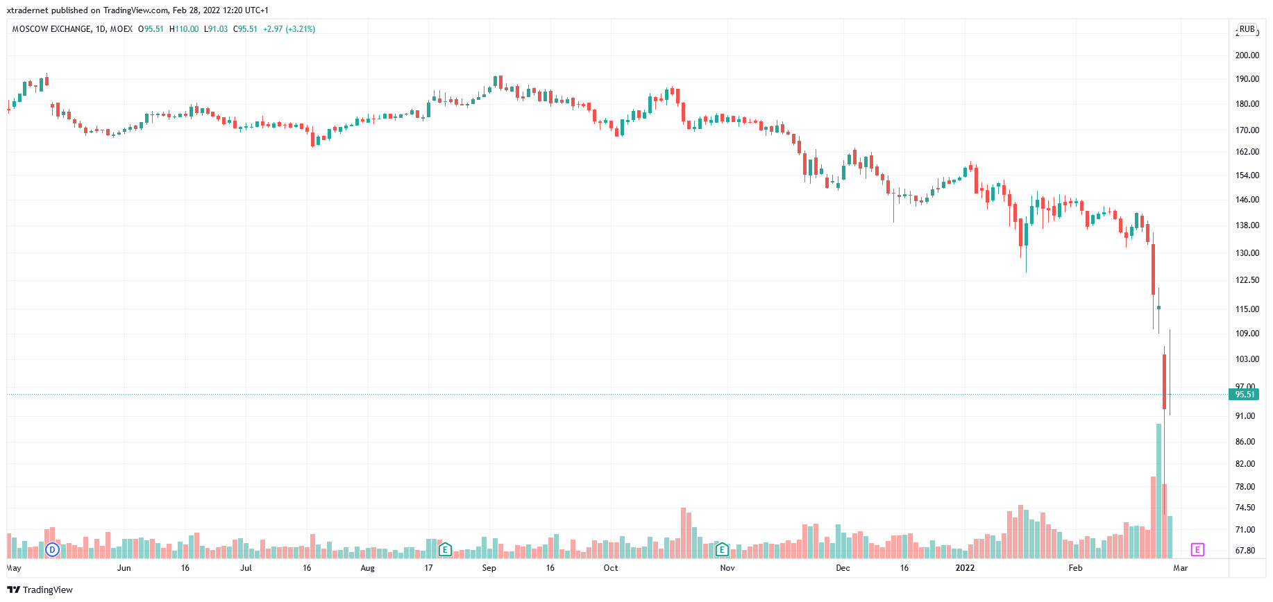USDRUB rompiendo salvajemente el nivel de 100 Rublos por Dólar. Desde que comenzaron los bombardeos lleva una depreciación del -40%