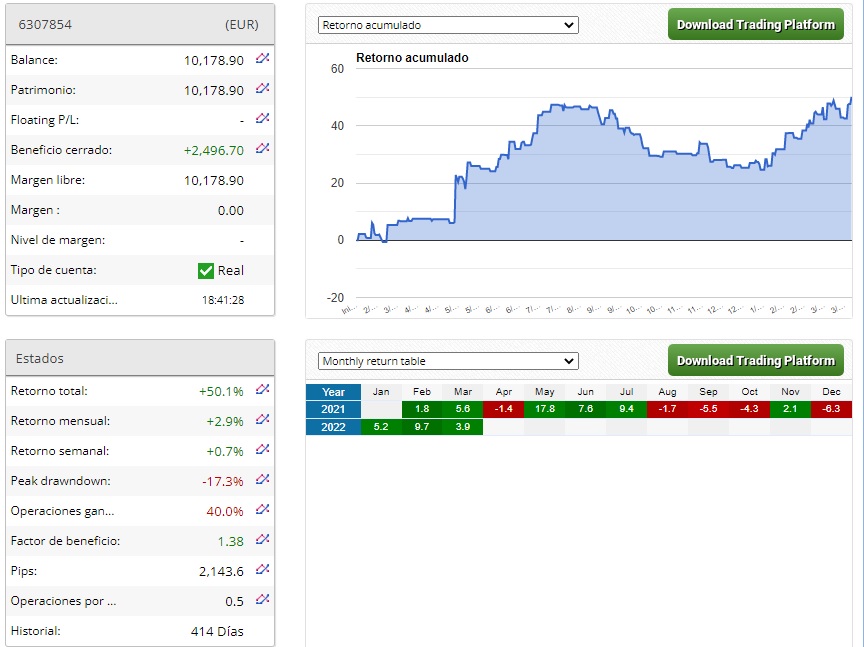 A pesar de este DD anual esta cuenta que esta ya abierta con todo mi conocimiento y experiencia acumulada de años da unos números muy satisfactorios para mi: https://www.fxblue.com/users/6307854 Además tengo un gran motivo de alegría después de cerrar este buen trimestre para mi y es que ya soy capaz de ganar de una manera muy solida en un entorno de alta volatilidad como el que hemos vivido por causa de la dichosa guerra. En el 2020 estuve 6 meses muy parado intentándome adaptar a la alta volatilidad y no lo conseguí pero ahora lo he podido hacer y la verdad es que las ganancias vienen incluso de una manera menos difícil ya que al hacer un trading tendencial gano más debido a los enormes movimientos que se dan en el intradía. Ahora ya si que se que puedo ganar de una manera solida en cualquier tipo de mercado lo cual me da mucha tranquilidad para el futuro.