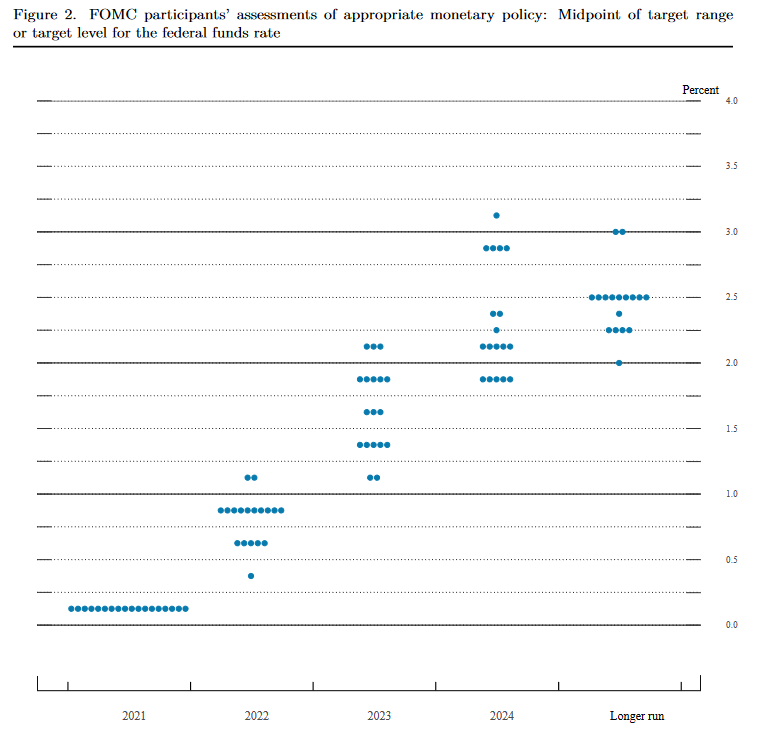 Sobre lo que comentas, en efecto, la Fed está avisando de que va a retirar estímulos y a subir tipos a lo largo de 2022. El dot plot que publicó el pasado miércoles la Reserva Federal en su resumen de proyecciones económicas lo dice todo: