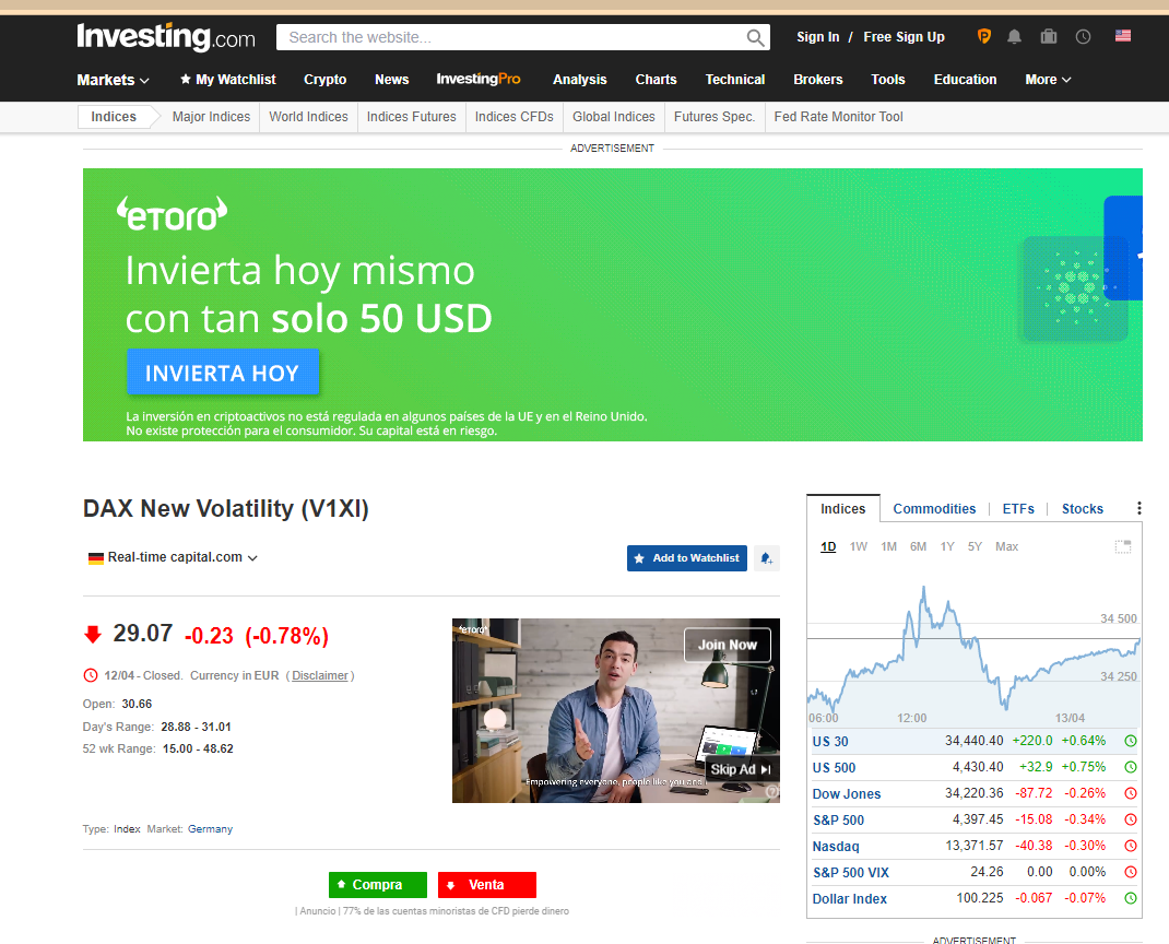 El VDAX se cotiza a partir de las 9:30h asi pues a las 8h veremos como ha terminado ayer que es 29,07. Vea adjunto. .Tu te refieres que pasa si sube encima de las 30 en el curso del dia. Esas deciciones son raras a tomar pues solamente adjuntamos las zonas si el VDAX cambia de 20 a 25, de 25 a 30 y de 30 a 35-
