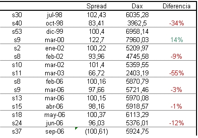 De las 7 veces, 7 han supuesto bajadas posteriores aunque de diferente magnitud. De ellas 6 han sido prácticamente inmediatas. La única excepción a esta inmediatez fue en diciembre del 99 cuando 10 semanas después de que el DAX cotizara por encima del FTSE aun se seguía subiendo. Aunque luego todo el mundo sabe lo que pasó.