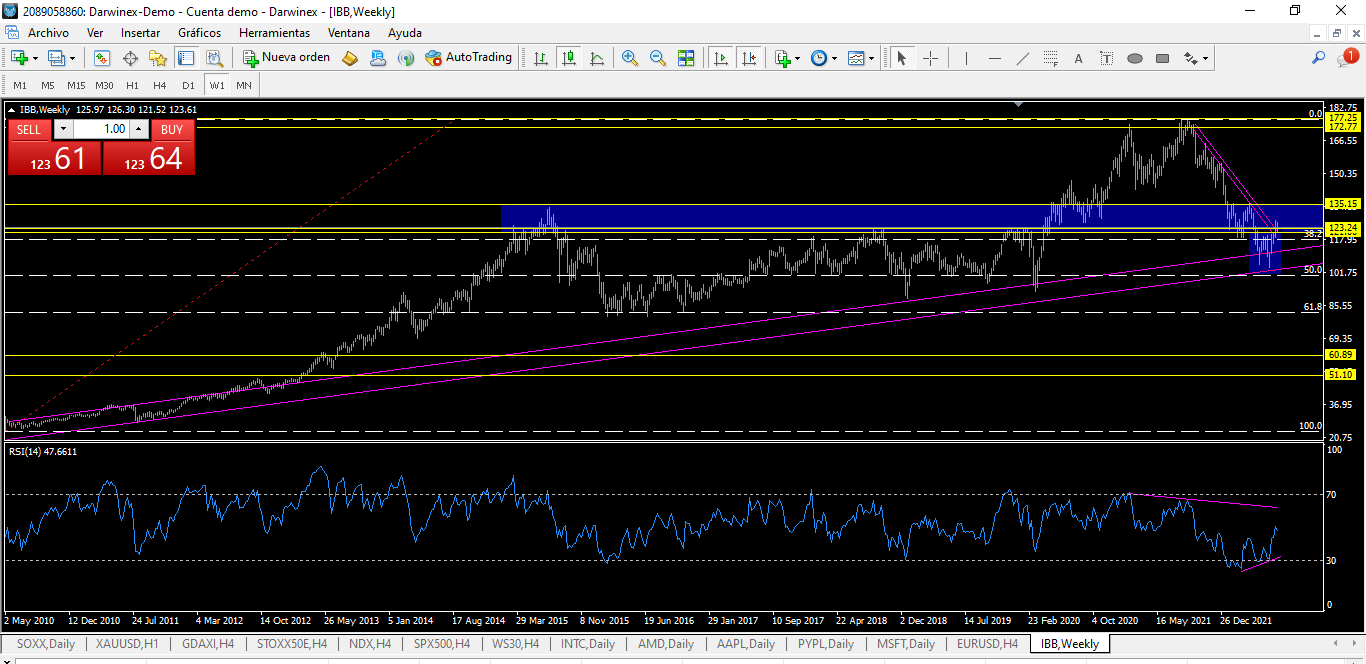 Buenos días, cansado de tanto mercado bajista, hay un etf, el de biotecnología, que tiene formación de vuelta, esto es lo que me gustaría ver en los índices, un doble suelo, corrección del 0,50 de fibo de toda la estructura alcista.
