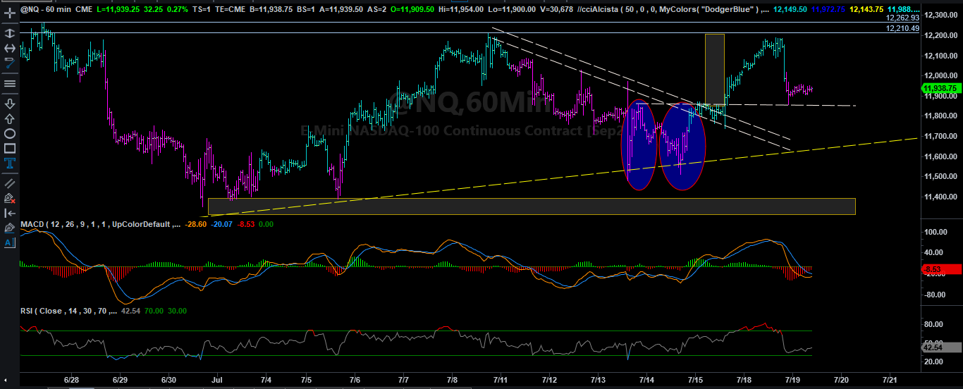 Buenos días, el viernes me fui a la cama con una sensación rara, de que algo no estaba saliendo según lo planeado. Si bajamos a gráfico de 60 minutos en el sp y nq observamos un HCH invertido y un doble suelo, en el caso del sp le da justo para sacarme de los cortos; en los timeframe más bajos las figuras suelen fallar más pues están sujetas a una mayor sensibilidad a las noticias pero esta tiene pinta de que si va llegar a objetivo.