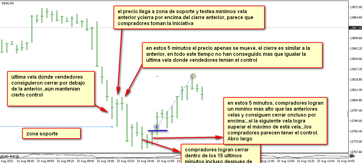 Se trata de ver el mercado básicamente teniendo en cuenta dónde cierran las velas con respecto a otros cierres. Aunque también hay que valorar si testea el mínimo o máximo de la vela anterior, y su tamaño. En base a esto..intento pensar quién tiene el control..compradores o vendedores.