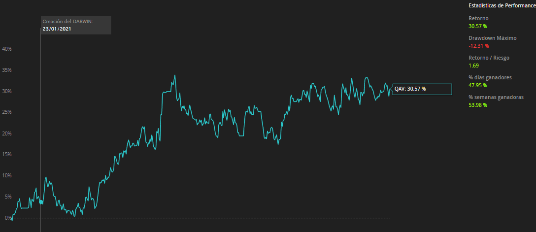 Hola Gerson, revisando la equity de tu Darwin parecería que la estrategia está entrando en un período de estancamiento (stagnation). ¿Has analizado en tu histórico cuánto tiempo ha estado en el pasado en esta situación antes de seguir creciendo? Te lo comento porque podría ser una señal temprana de que el sistema se esté rompiendo (o al menos degradando).