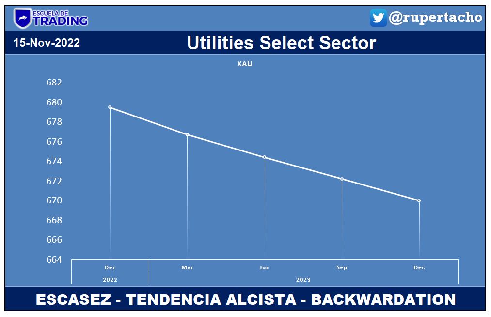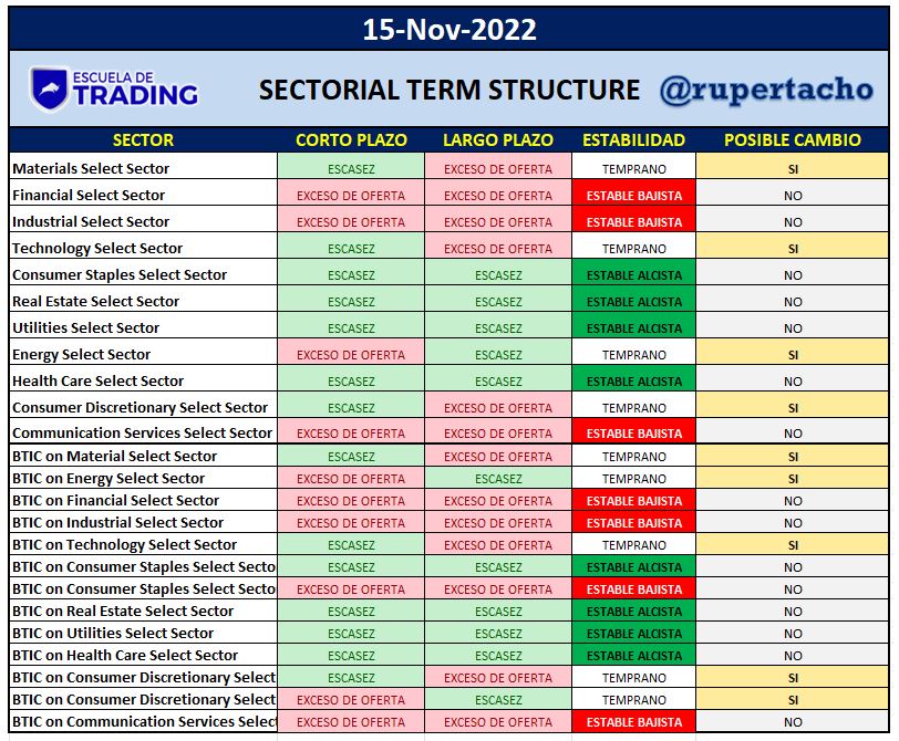 Simplemente, miramos los futuros sectoriales y comparamos precios ACTUALES de sus vencimientos FUTUROS, es una forma de medir el Exceso de Oferta y la Escasez.