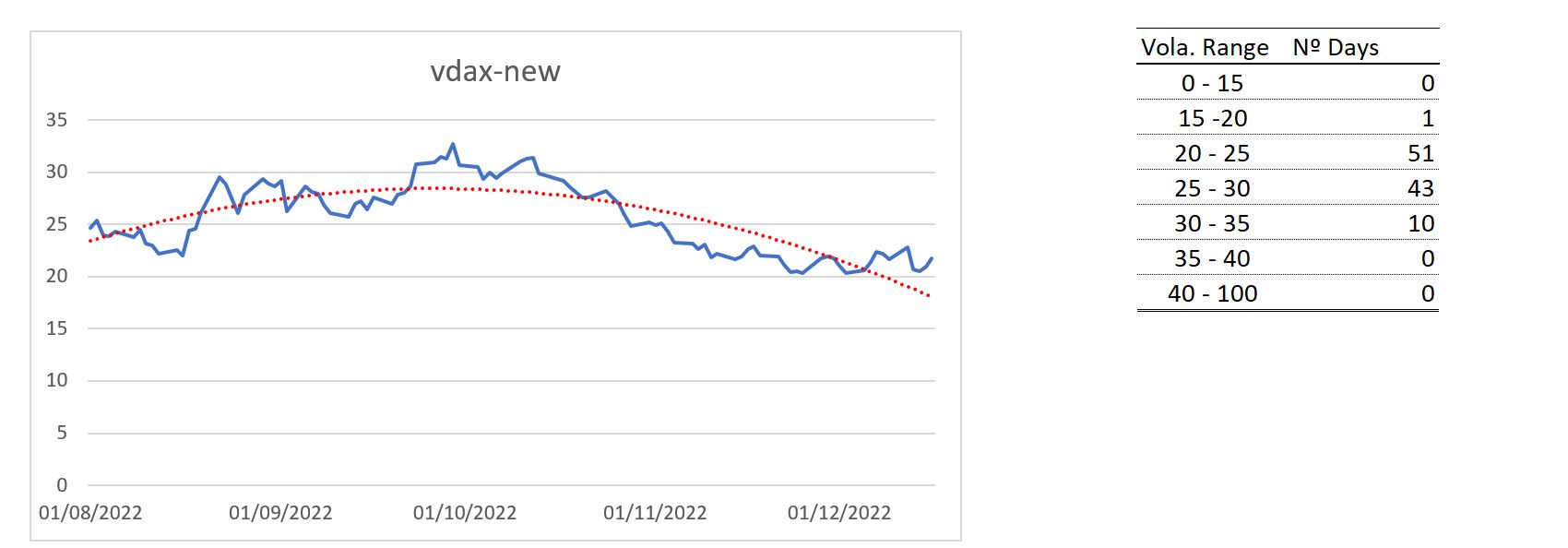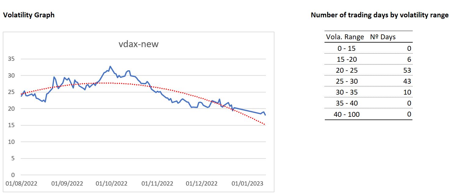 1) Clasificación de los días según los tramos de volatilidad: Cabe destacar cómo la volatilidad comprendidas entre 20-25 puntos de VDAX-new ha pasado a ocupar el primer puesto con 51 días