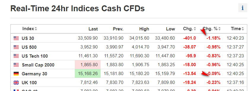 El DOW estuvo en números rojos todo el día y, como los precios siguieron bajando, el DAX también tuvo que retroceder desde el máximo del día, aunque sólo bajó ligeramente en el mínimo.
