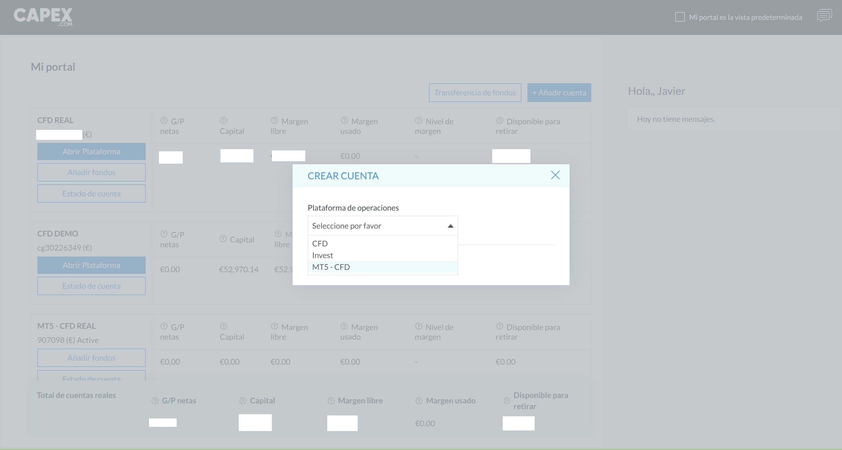 En capex si no creas la cuenta MT5 en el webtrader no te da el numero de usuario. Por lo tanto no puedes añadir tu cuenta a meta trader.