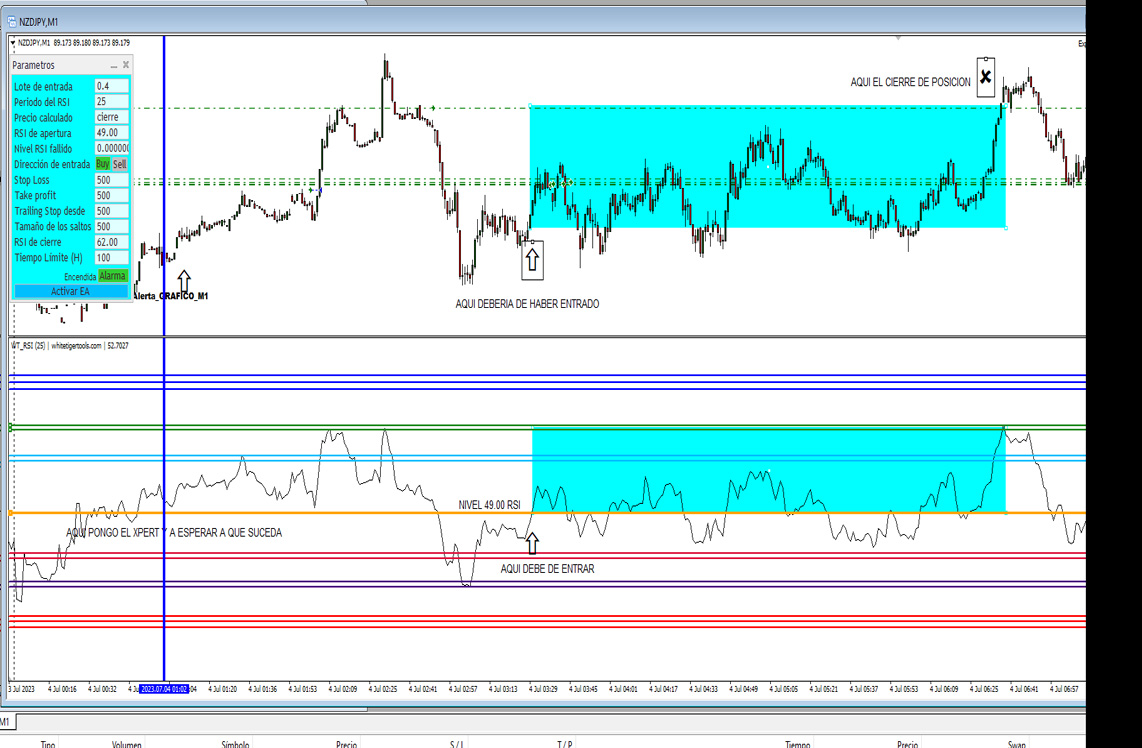 Aquí en el gráfico se ve cómo la finalidad es que el RSI entre al nivel de la linea amarilla en compra, que la toca y que prosiguen varias velas hasta que se vuelve a meter hacia arriba, en ese punto es donde deben ejecutarse todo el Xpert.
