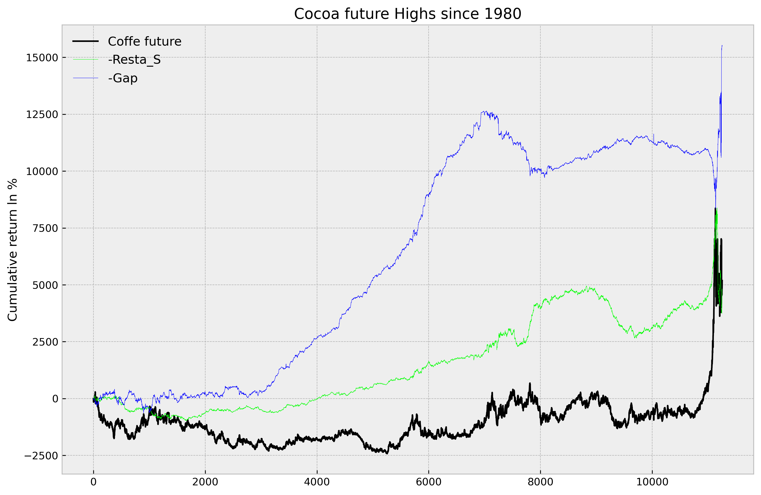 Ahora, y gracias al modelo de las Bandas RSG, podemos saber ese máximo, de hecho los modelos se han ampliado, desde la base de Investing EEUU, y se han construido muchos modelos desde los años 80. El modelo detecta mas máximos si lo trazamos al completo, pero para que se vea bien ese super máximos, trazamos solo 3 líneas, el cacao, su gap de apertura, y su R (HL(-) - HL(+)). Lógicamente, si los investigadores, no investigan el gap de apertura, pues no podrán detectar ese máximo, no les hubiese sido tan fácil, aunque seguro que hay más formas de hacerlo