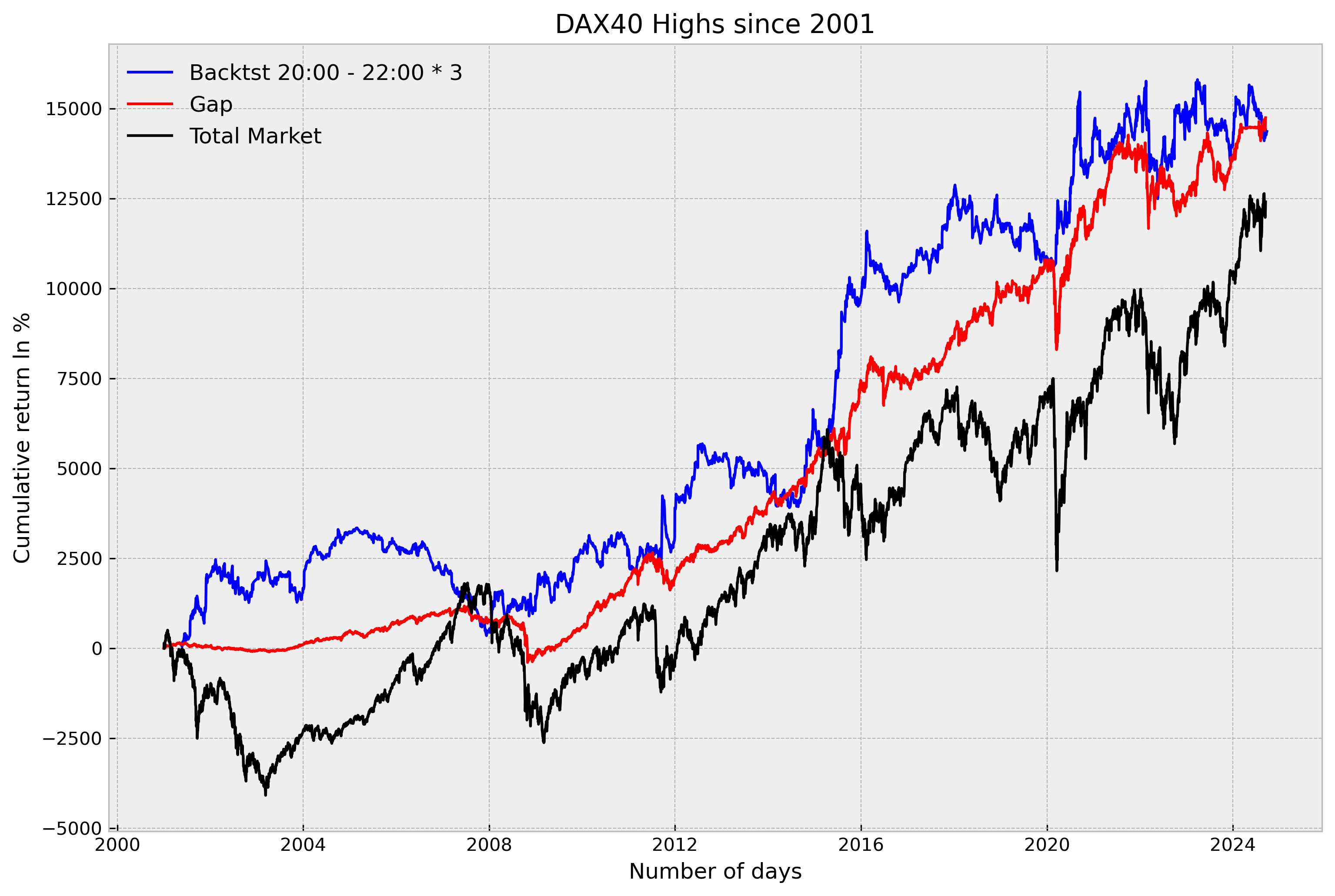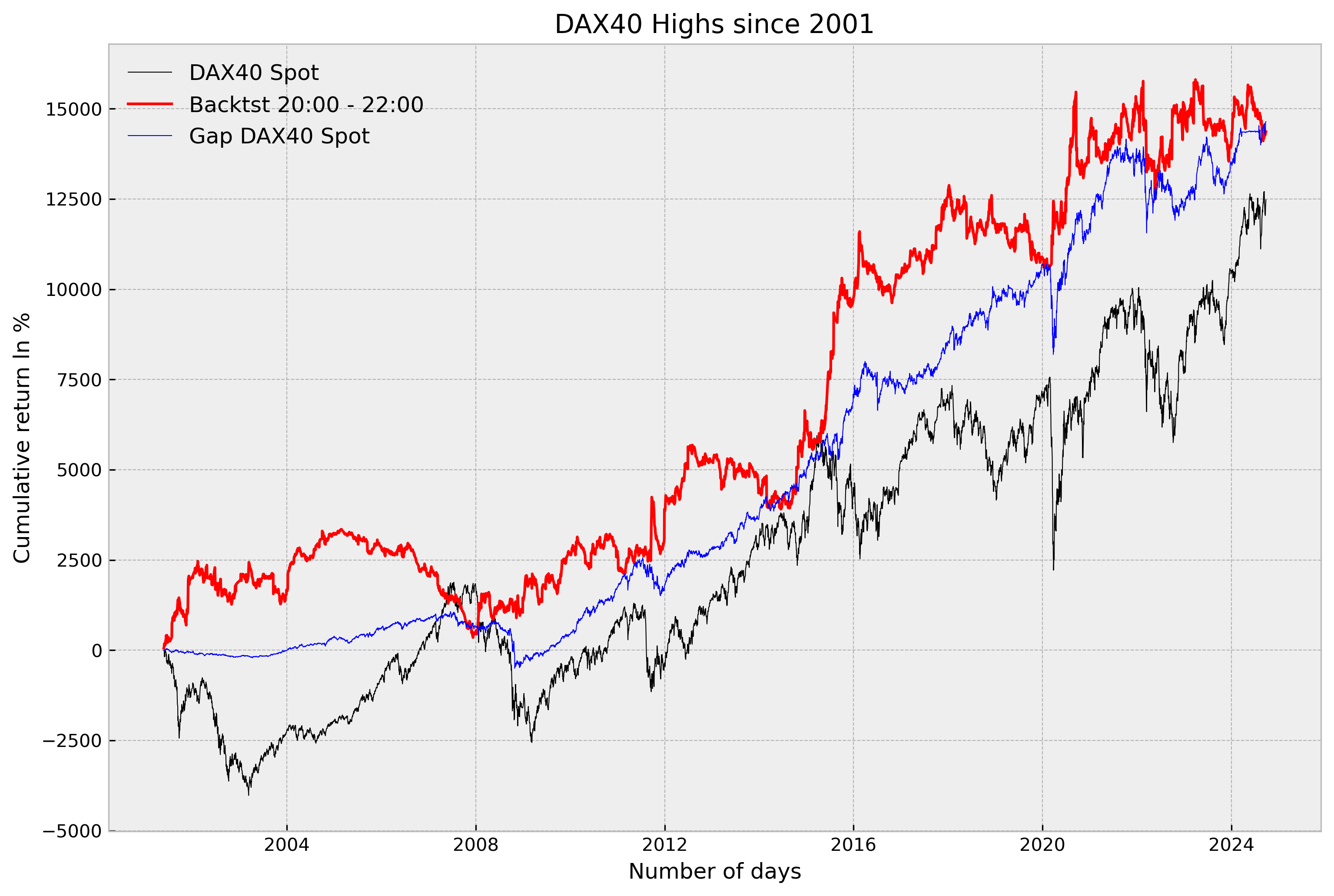 Y siguiendo con este hilo de los back Test, donde veíamos como el BT que opera las 2 ultimas horas de mercado mas el gap, era la curva de total market. Comprobamos ahora como eliminando ese gap, ajustando mas el BT. y creando un BT real que opera las dos últimas horas de mercado del DAX40, equivale al gap de apertura, generado una curva de rendimiento donde el gap actúa como soporte el backtest desde las 20:00 hasta las 22:00.