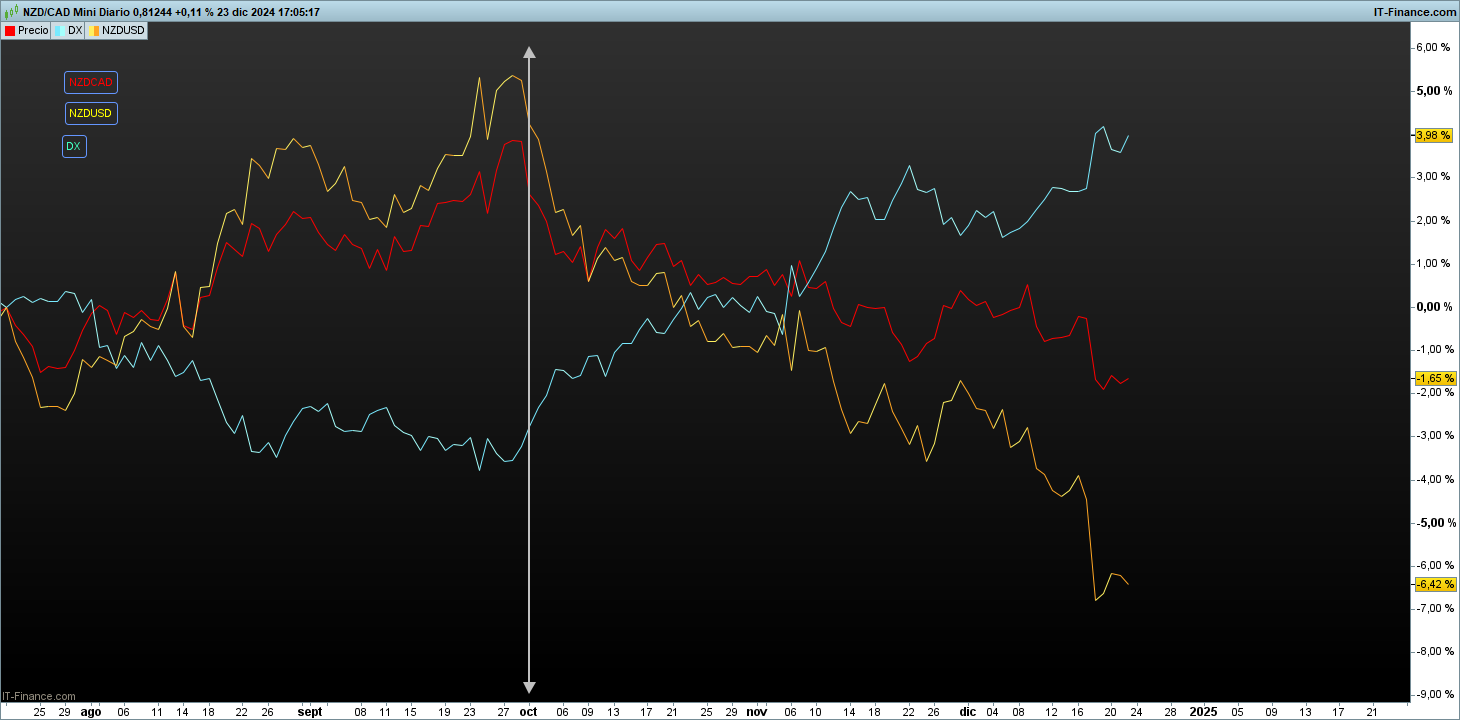 Si en otra grafica montamos un spread con DX y NZDCAD, se observa que ese spread esta largo en fuerte tendencia alcista desde primeros de octubre