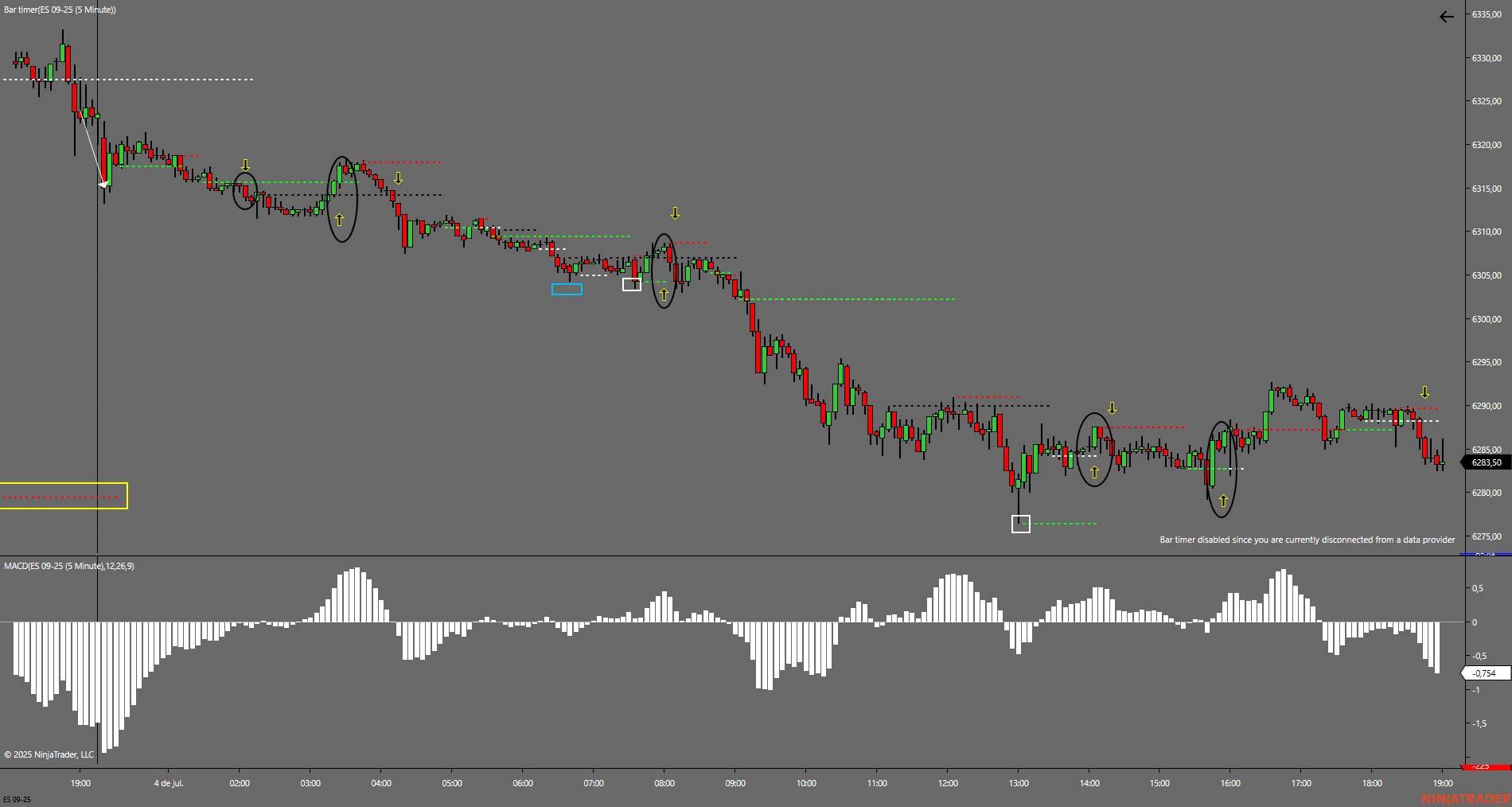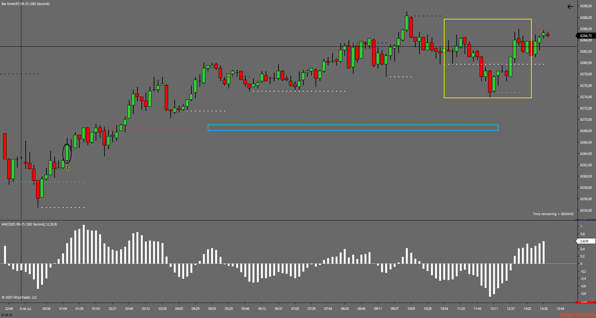 Aplicaremos dos indicadores un MACD y un doble gestor de CICLOS generadores de zonas criticas S/R cíclica con sus parámetros por defecto con un par de normas muy básicas.