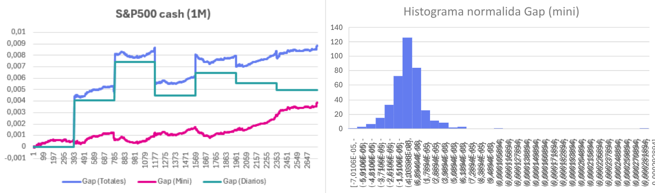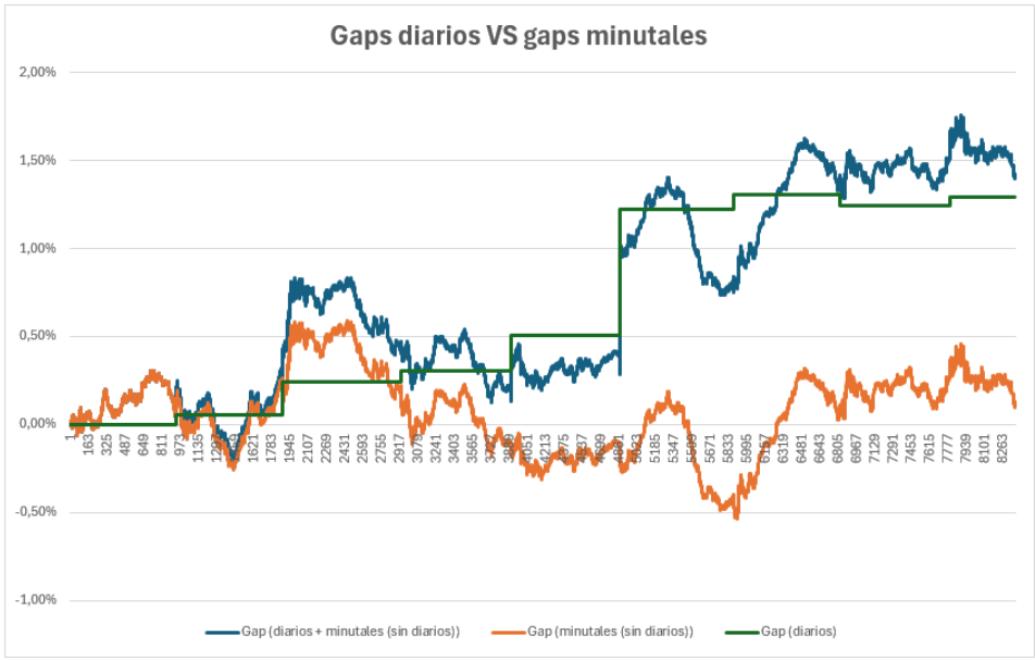 Los resultados que vemos en las gráficas anteriores, son consistentes con la bibliografía académica existente,, ya que la tendencia de los gaps entre velas de 1 minuto en valor acumulado, siguen la misma evolución del mercado (cosa que no tiene porque hacer el gap de apertura en times frames de 1D). Eso ya se ha demostrado.