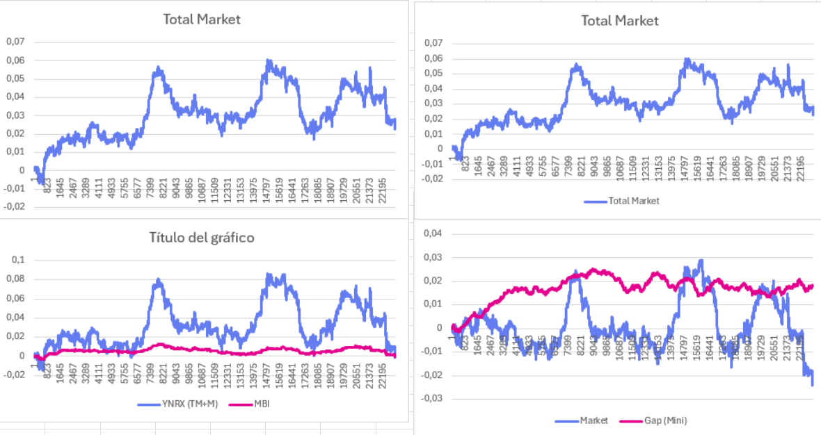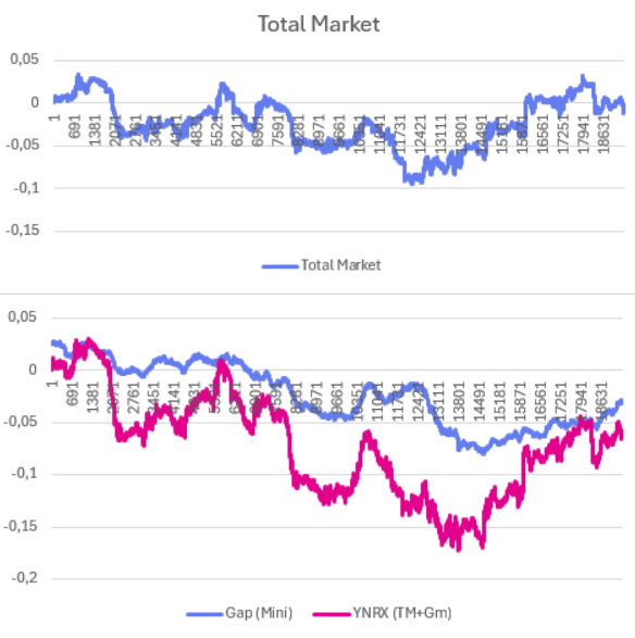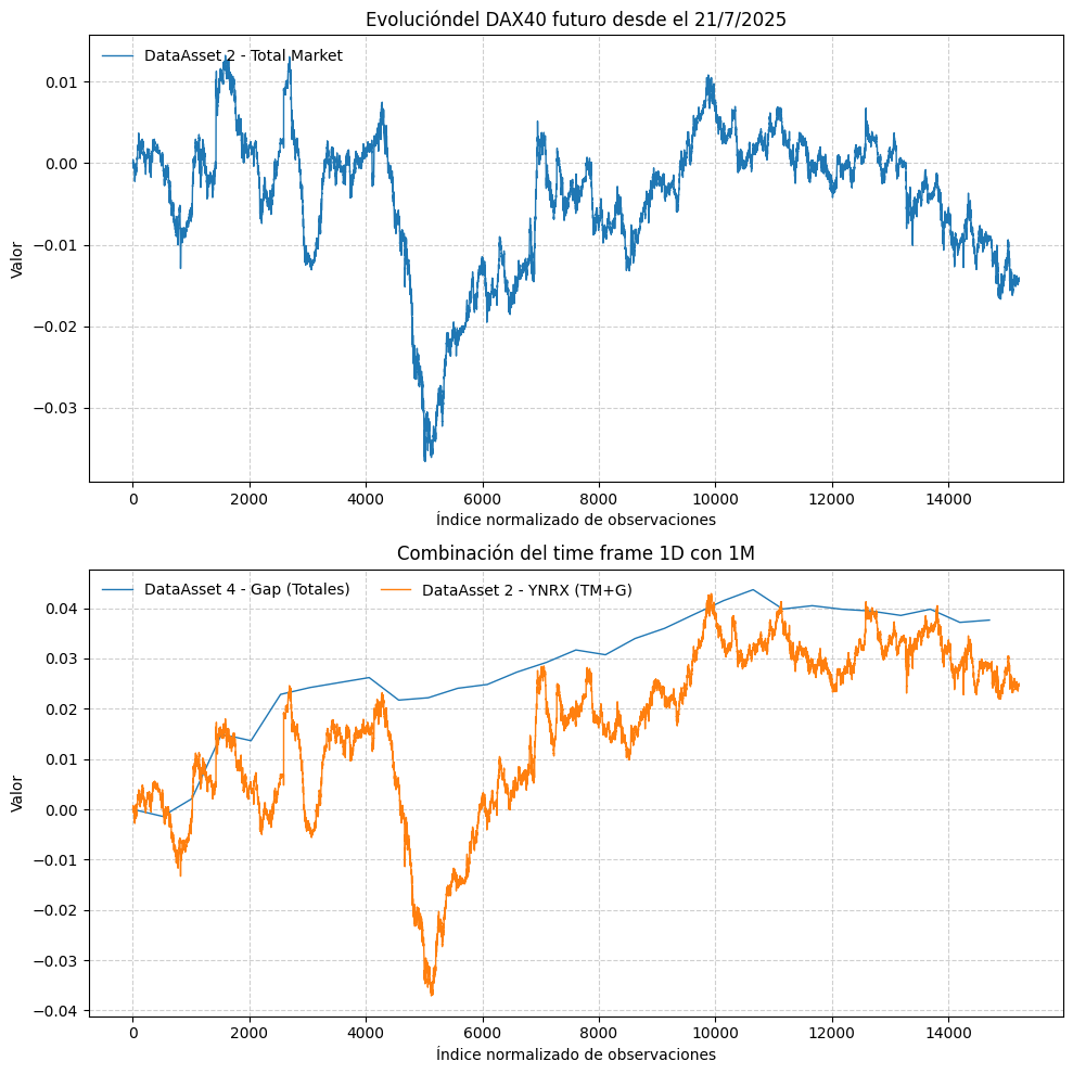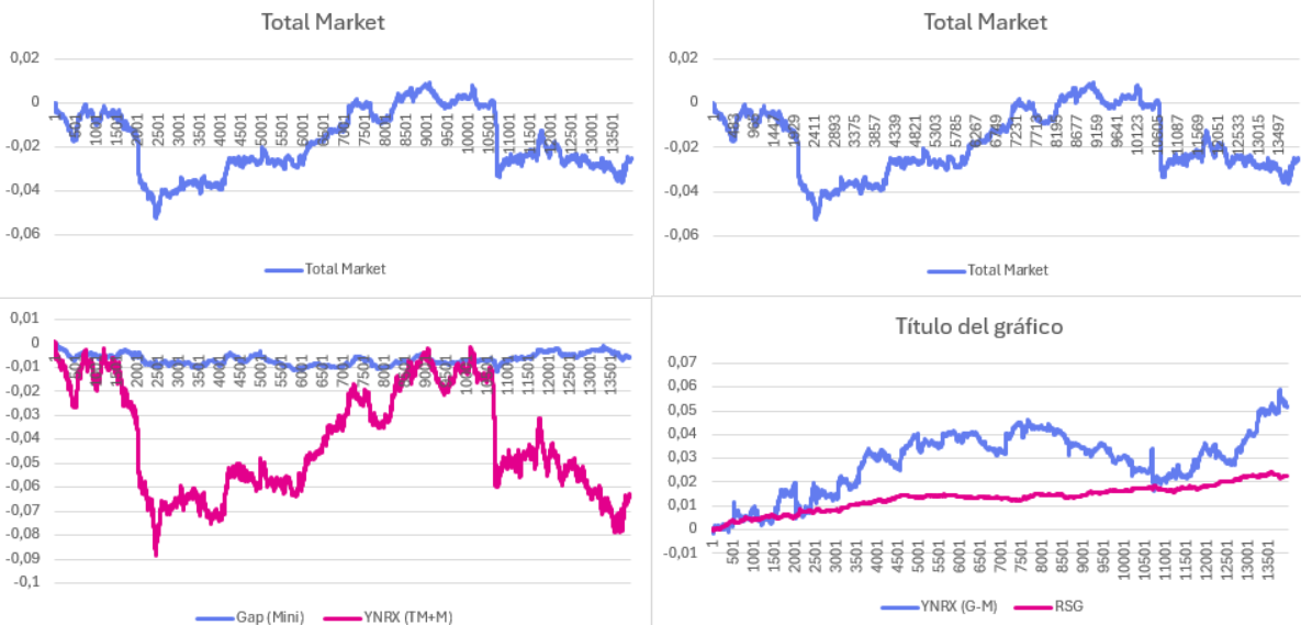 Para demostrar esta afirmación, se construye los componentes Market, Total Market, así como los modelos YNRX, MBI y RSG, con la data a 1 minuto de Trading View sobre el futuro del DAX40 (EUREX), en el máximo histórico de datos que me permite descargar la plataforma, osea desde el 21/07/2025 y en mas de 24.000 observaciones minutales