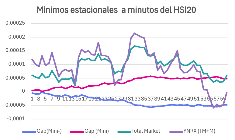Ciertamente X si simplemente cambiases la fecha de inicio un par de horas, no se marcarían los máximos y mínimos, pero la pregunta es por que si calculamos la estacionalidad a minutos de esa fecha de inicio dos horas después en el HSI20, se sigue marcando a través del mini gap los mínimos estacionales de ese activo