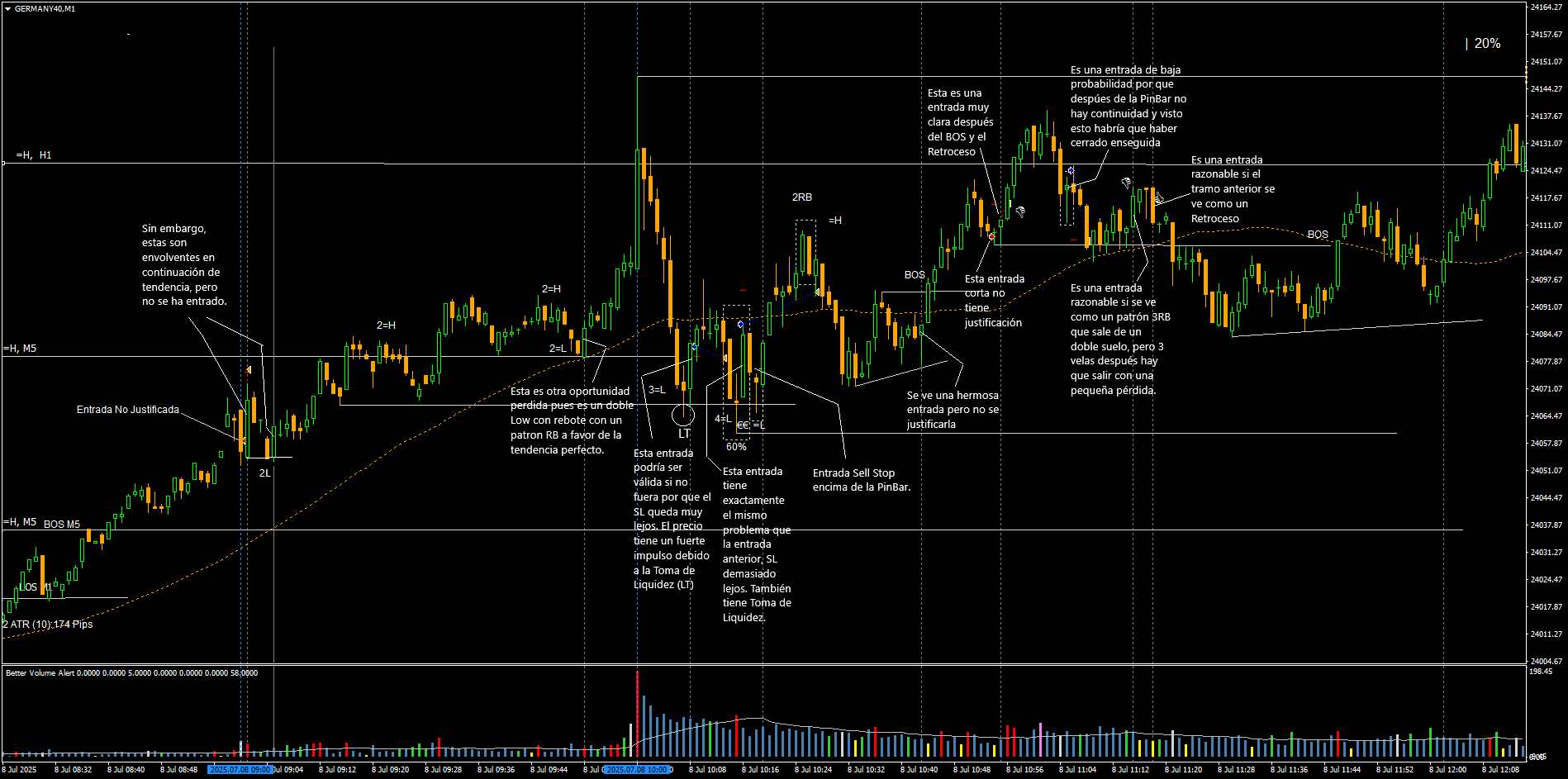 Hola amigos, el DAX es un activo muy atractivo. Algo caro para mí pero con bastante volatilidad y comportamiento bastante noble. Yo estoy operando en él, en el marco de un minuto desde hace algunas semanas. La verdad es que no he conseguido batirlo de manera regular, pero si que me divierte muchísimo. Opero entre dos y tres horas cada día desde la apertura Europea (Frankfurt) Ocho de la mañana hora de España. Mi rutina es ponerme un poco antes a trazar líneas horizontales desde H1 hasta M5. Las líneas M1 las voy tirando a medida que el precio se desarrolla. Utilizo la analisis técnico con la acción del precio. La tendencia la veo con la estructura de los precios: Highs y Lows. En ocasiones consulto el volumen (de ticks).