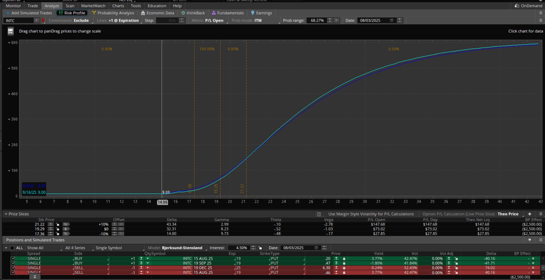 Ayer cerré la put19 de agosto y me llevé la vendida de octubre a diciembre. El resultado es bastante distinto del que calculé con los precios de cierre del viernes a causa de la recuperación de ayer, que aunque no fue de envergadura, como era de esperar me machacó la put19 por el efecto de theta.