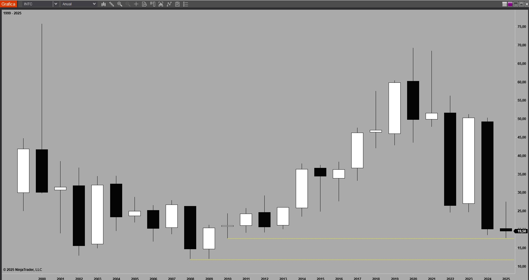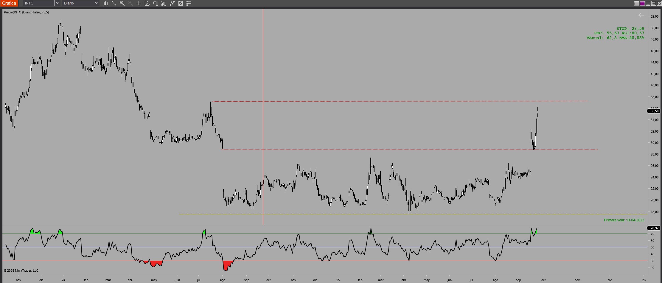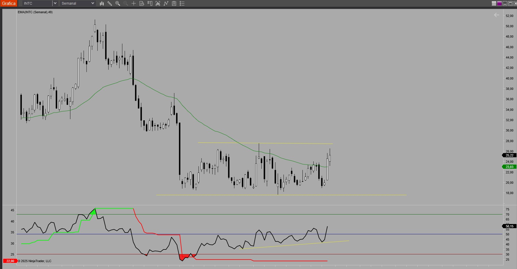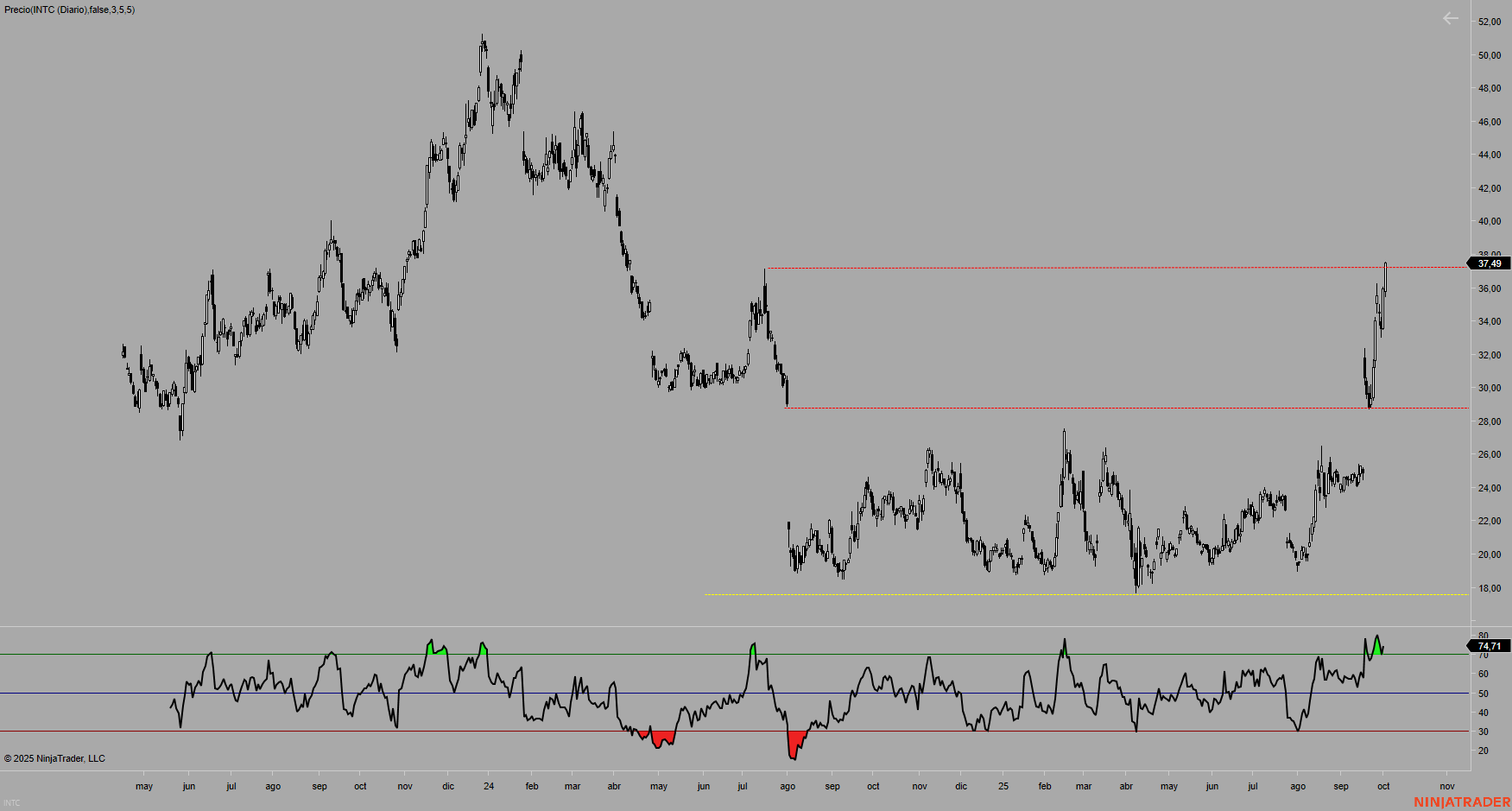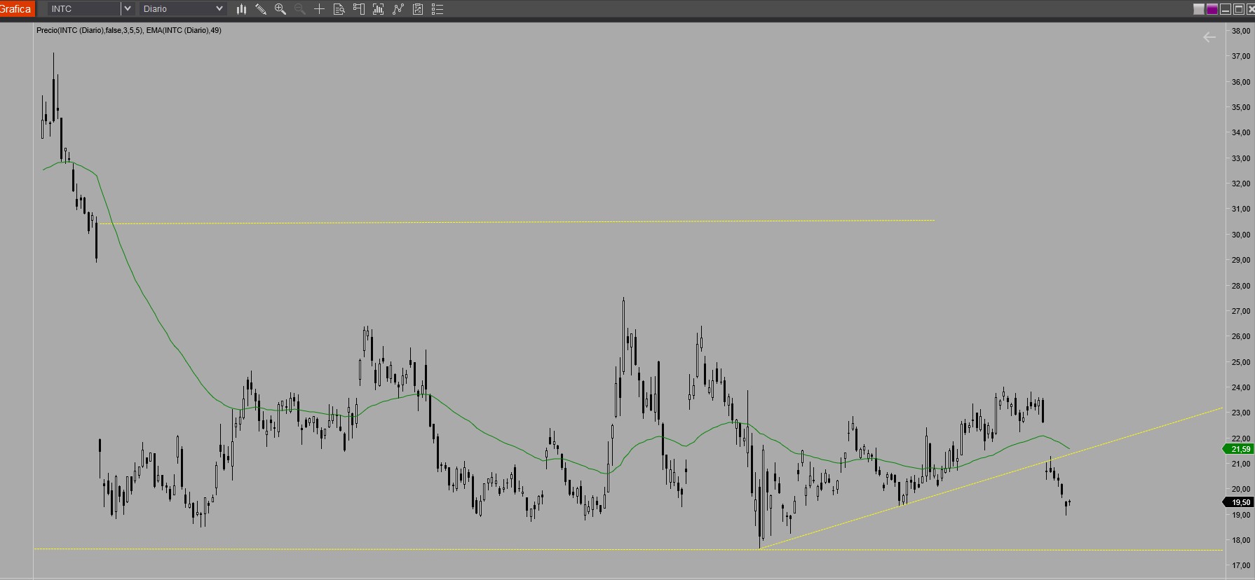 En INTC vemos que es difícil predecir el comportamiento de ciertos activos que están sujetos a una gran volatilidad. Su gráfico es una fábrica de huecos.