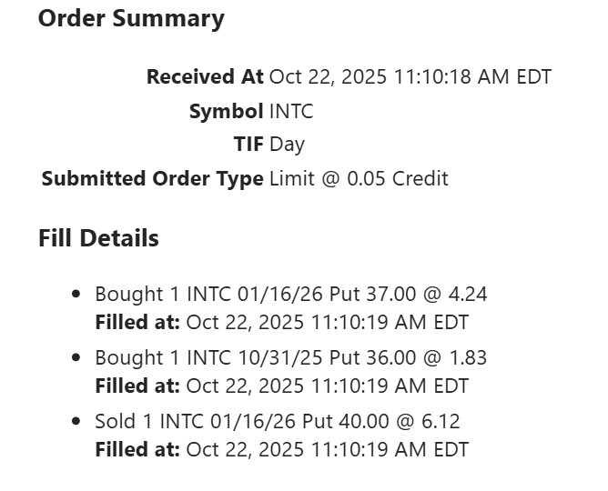En cuanto al trade de INTC, el viernes a poco de la apertura rolé a 37 embolsando algo más de prima y acercando el strike al ATM. Más tarde cuando empezó la fiesta no pensé en comprar una put, me distraje con unas mariposas y vendiendo spreads bajistas hasta el cierre.