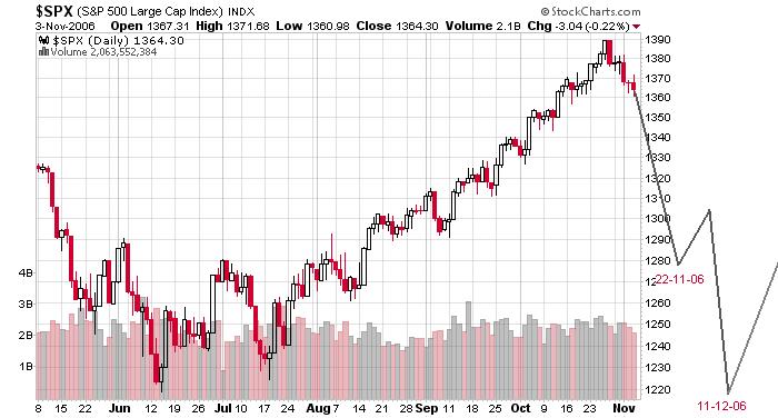 Esto es un posible escenario para las proximas semanas,basado en la metodologia ciclica propia con la que trabajo.Destacaria las fechas de 22-11(quizas suelo secundario) y 11-12(suelo principal) -+ unos dias como posibles suelos de mercado,hacia mitad de diciembre es posible un suelo y una recuperacion hacia fin de año.Esperaria al menos un 1220 para el s&p500,con posibilidad de niveles inferiores, hacia los minimos de octubre 2005.