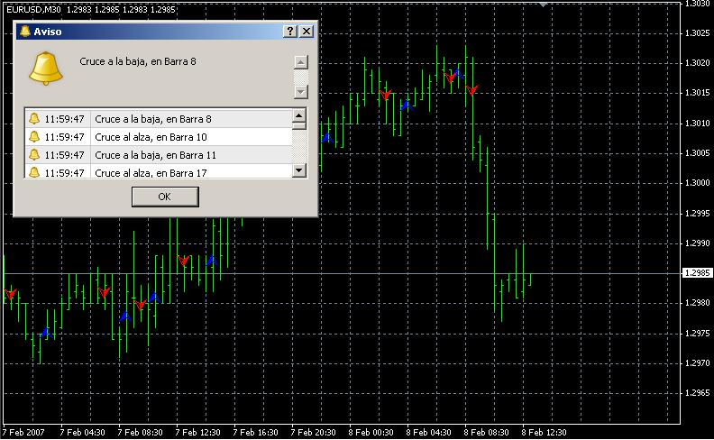 El funcionamiento es sencillo, he dejado el indicador solo con los indicadores justos, (jeje es que parecía una feria).... cuando aparece una barra verde es señal de compra, y si es roja, la señal es de venta, de todas formas te avisa de las entradas, como una imagen vale mas que mil palabras...