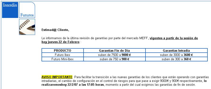 En vez de aumentar garantias lo que debian hacer es bajar el precio del pipo, es vez de costar 10 euros, que costase 5, una vez hecho esto bajar las garantias a 4000 euros y ya verian como aumentaba el volumen, disminuia el spread y las posiciones estarian mas llenas, aparte que MEFF ganaria el doble en comisiones... En fin... que le vamos hacer... esto es España... jeje...