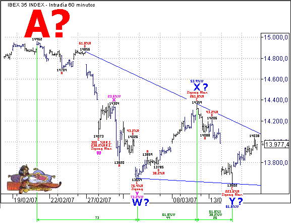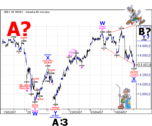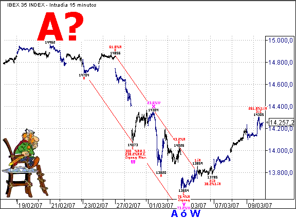 En el estricto corto plazo en el momento actual, un rebote en torno a los 14600 puntos podría ser factible, dada la sobreventa existente en gráficos horarios, descendiendo posteriormente nuevamente a las inmediaciones de los 13500 puntos anteriormente citados, donde podría finalizar una onda B de dicho Zigzag, pero... esto habrá que observarlo mas detenidamente...